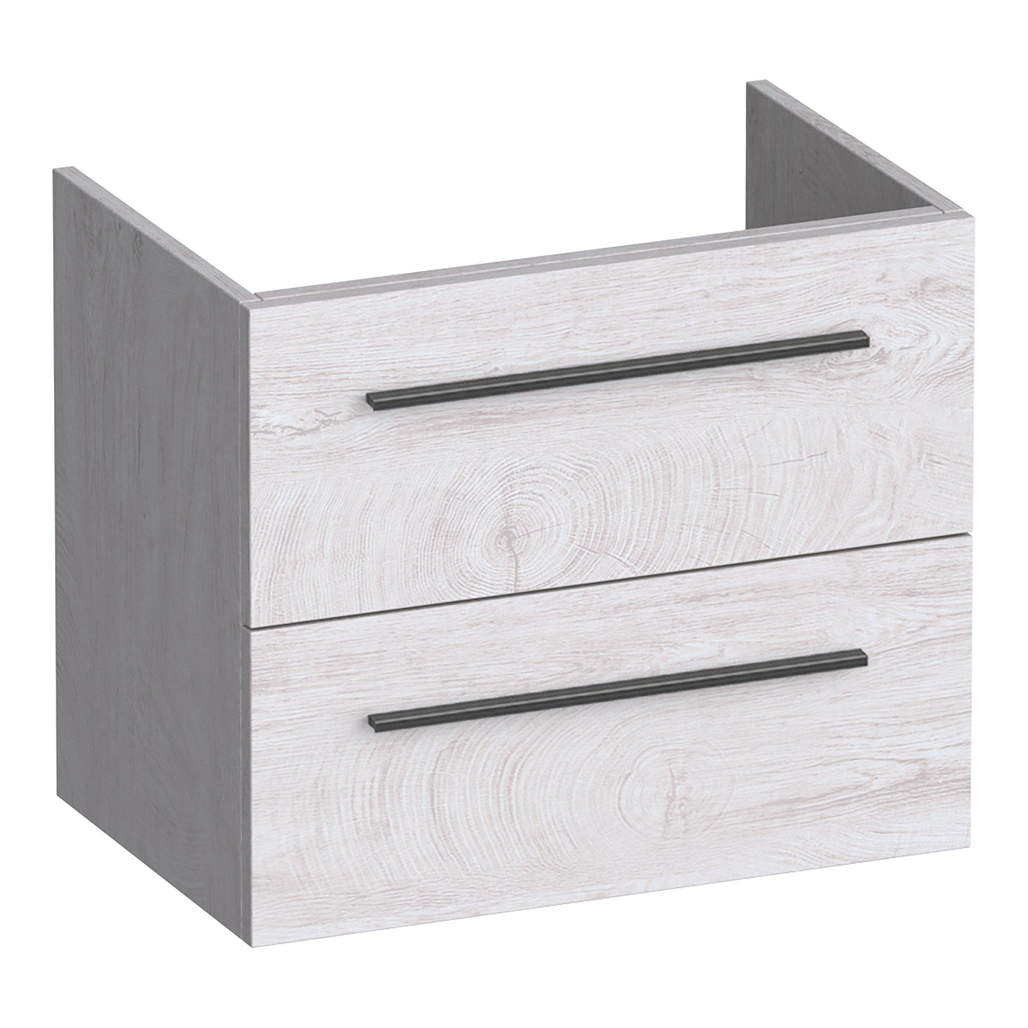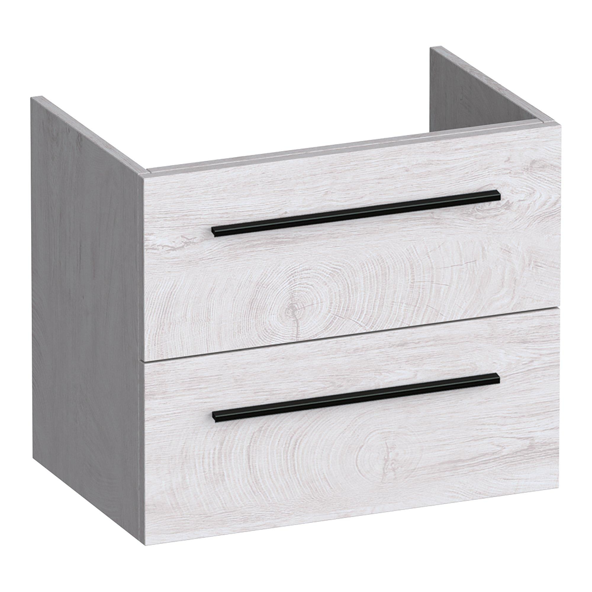 Avec une largeur de 59 cm et une faible profondeur d’environ 38-39 cm, ce meuble a été spécialement conçu pour les salles de bains et toilettes compactes. Les deux tiroirs exploitent de manière optimale l’espace disponible, afin que vous puissiez ranger vos produits de soin, serviettes et essentiels du quotidien bien à l’abri des regards. La découpe intégrée pour siphon permet de dissimuler facilement l’évacuation sans perdre beaucoup d’espace dans le meuble. Grâce à la fixation murale, la pièce paraît plus grande et vous pouvez nettoyer aisément le sol en dessous. Vous profitez ainsi d’une solution à la fois pratique et aérée, exactement ce dont vous avez besoin lorsque chaque centimètre compte.