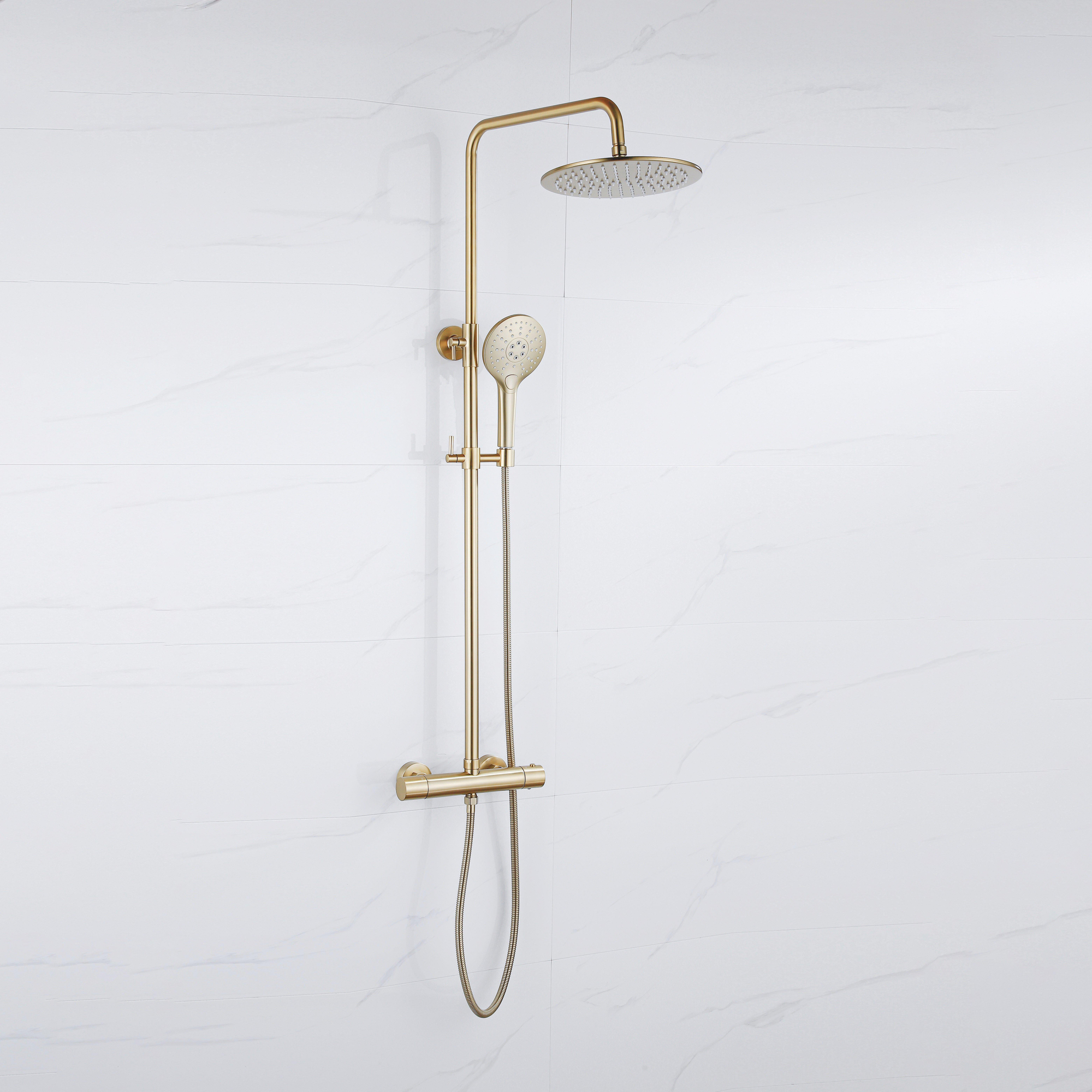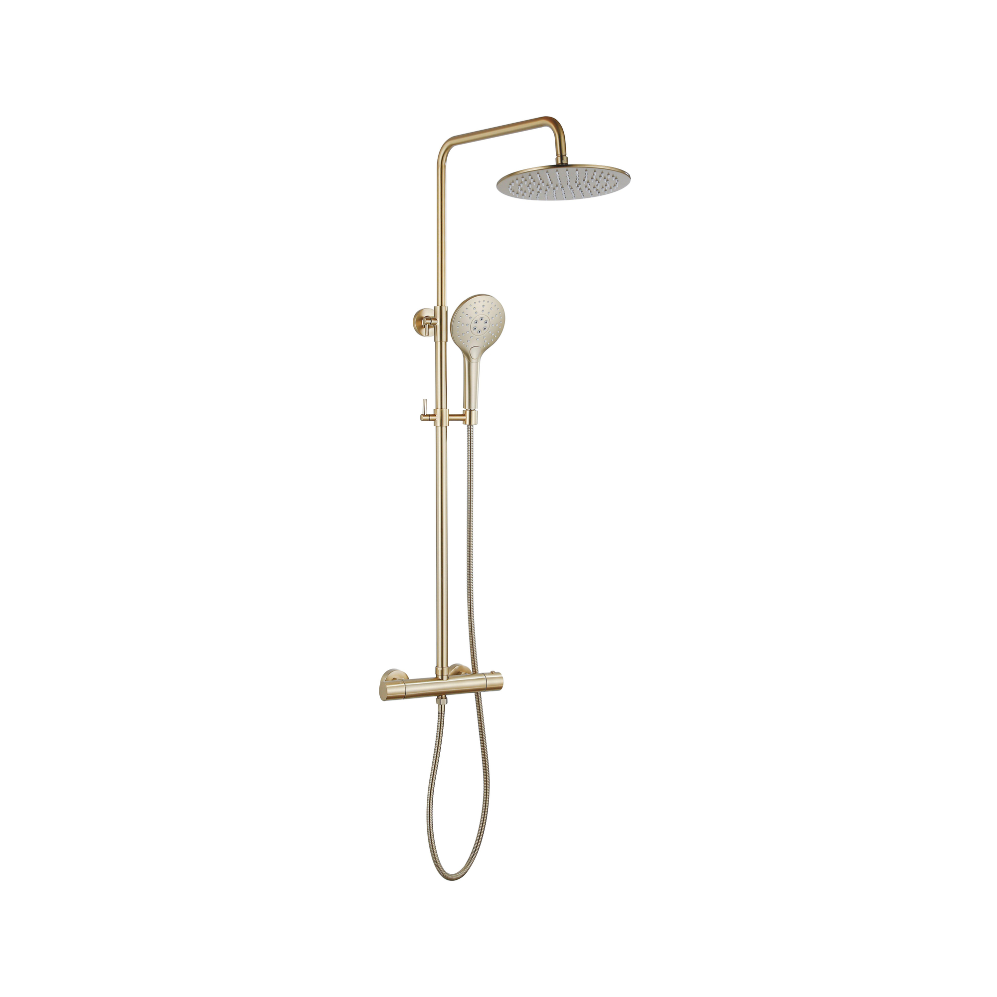 Fortifura Calvi Ensemble de douche de pluie - thermostatique - pomme de douche 30cm - flexible métallique - douchette ronde - Laiton brossé PVD (Or)