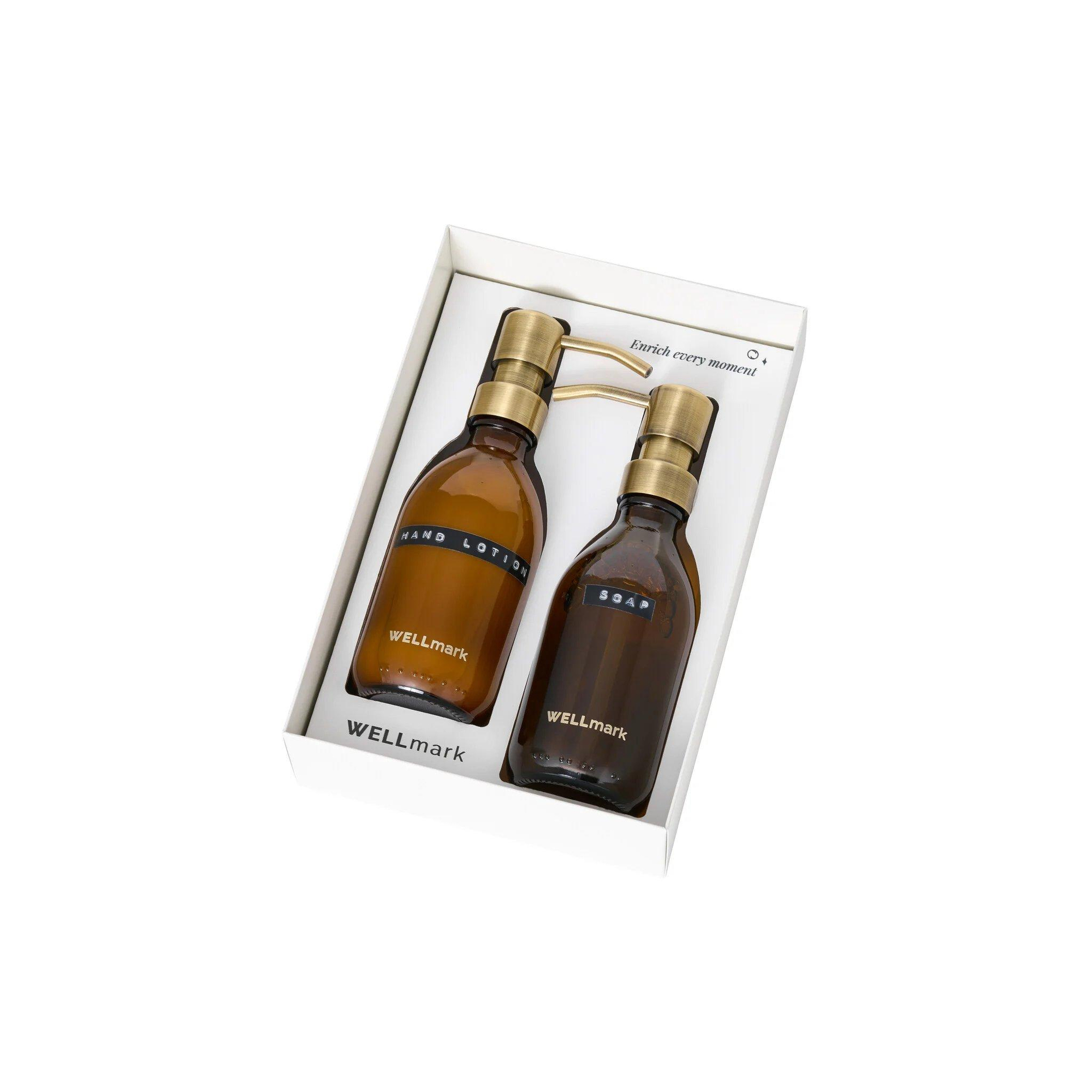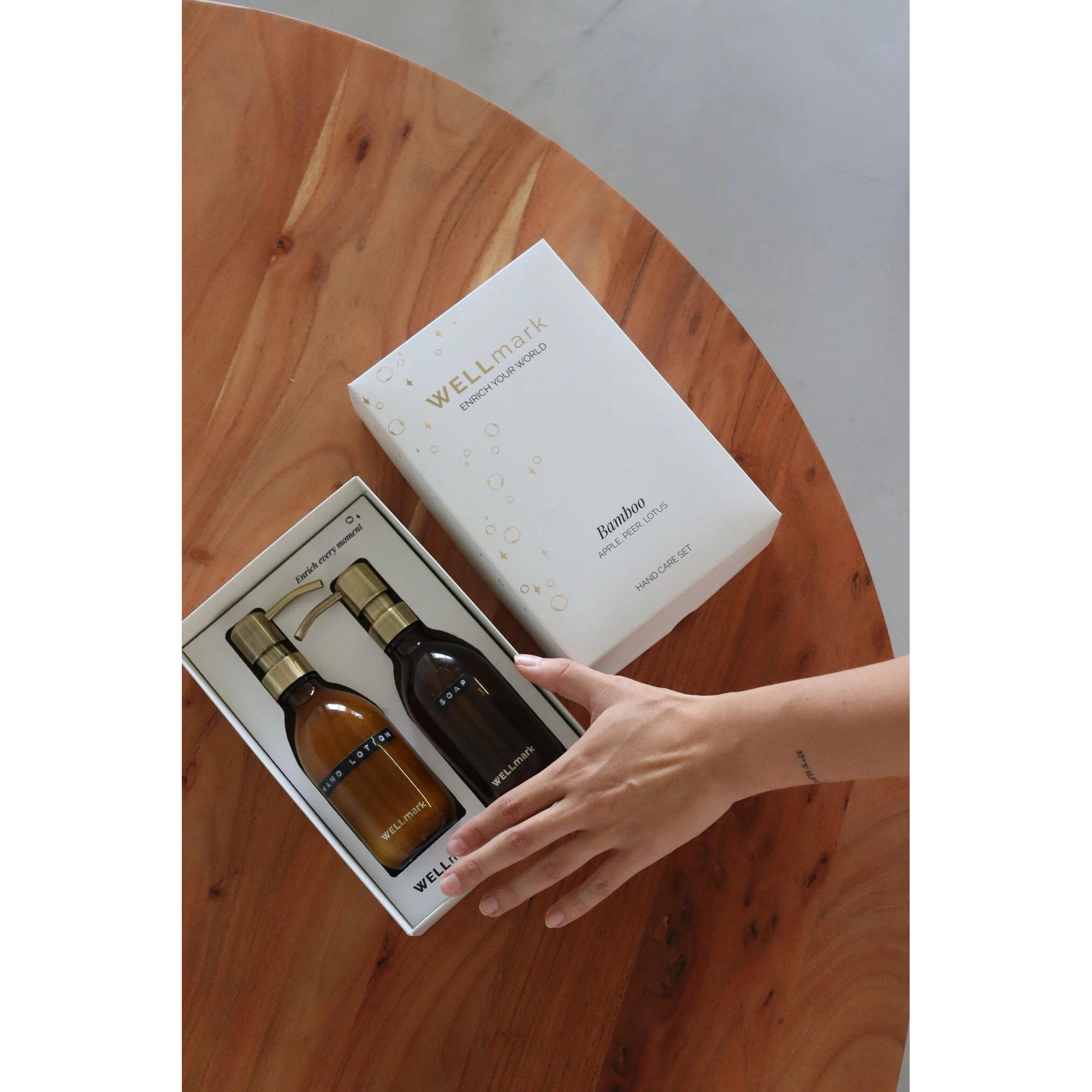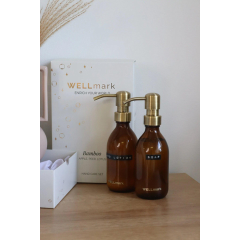 Wellmark Coffret soins des mains giftset - crème pour les mains 250ml - lotion pour les mains 250ml - bambou - ambre - texte : soap