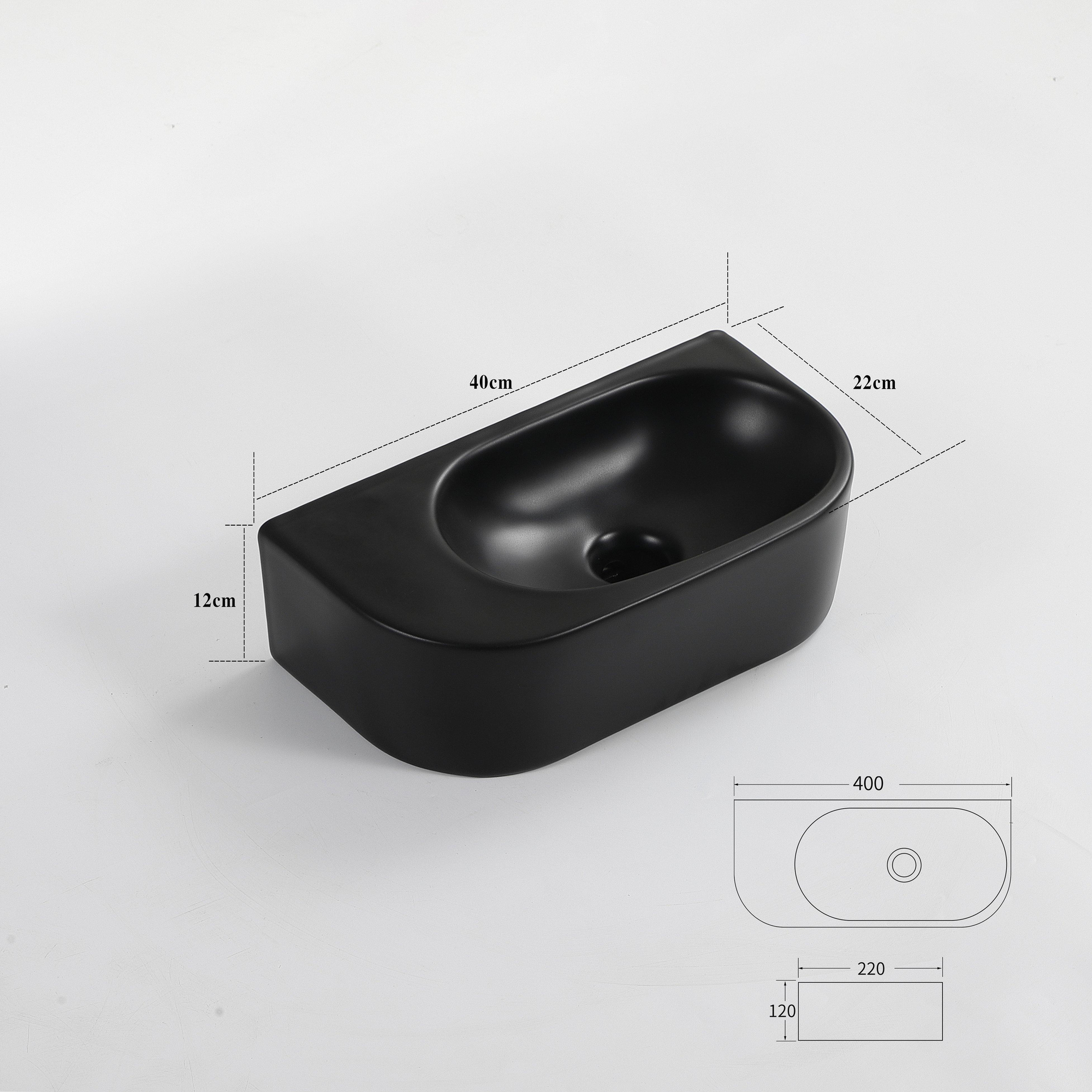 QeramiQ Pure Lave-mains - 40x22x12cm - Lisse - demi-rond - sans trou de robinet - Céramique - Noir mat