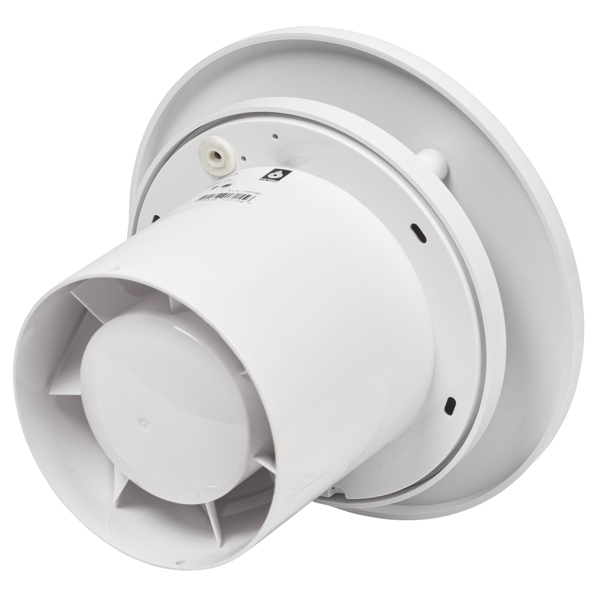 - Ventilateur design rond avec façade blanche, adapté à presque tous les styles de salle de bains.