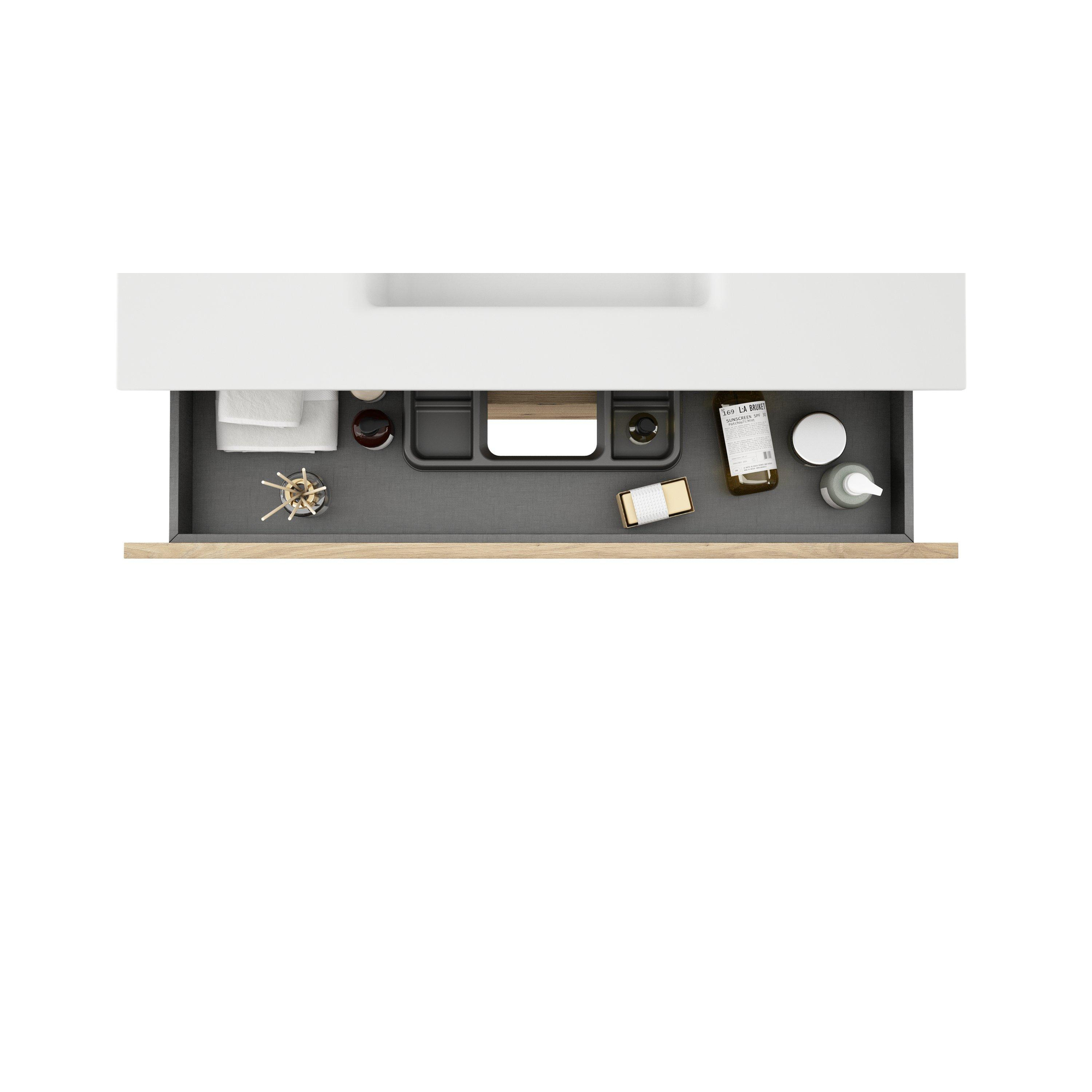 Avec sa largeur de 100 cm, le meuble bas de salle de bains Saniclass Chaci est idéal pour des salles de bains de différentes tailles. Les tiroirs sans poignées assurent une apparence homogène et facilitent le rangement et la recherche de vos affaires. La couleur chêne donne au meuble un aspect unique et en fait un véritable accroche-regard dans la pièce. Ce meuble bas de salle de bains combine fonctionnalité et esthétique de manière harmonieuse.