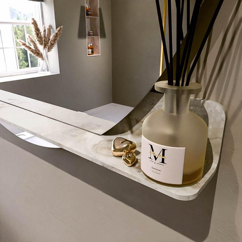 La tablette intégrée aux angles arrondis n’est pas seulement esthétique, elle est surtout très pratique au quotidien. Vous disposez toujours d’un endroit pratique pour les brosses à dents, le savon, le parfum ou les produits de votre routine du matin, sans que votre lavabo soit encombré ni que vous ayez besoin de monter des étagères murales supplémentaires. Les formes arrondies offrent une impression de douceur et de sécurité, y compris pour une famille avec enfants. Comme le miroir et la tablette ne forment qu’un seul ensemble, le mur paraît calme et organisé. Surtout au-dessus d’un meuble-lavabo aux lignes épurées ou dans des toilettes, cela apporte immédiatement un aspect luxueux et bien pensé.