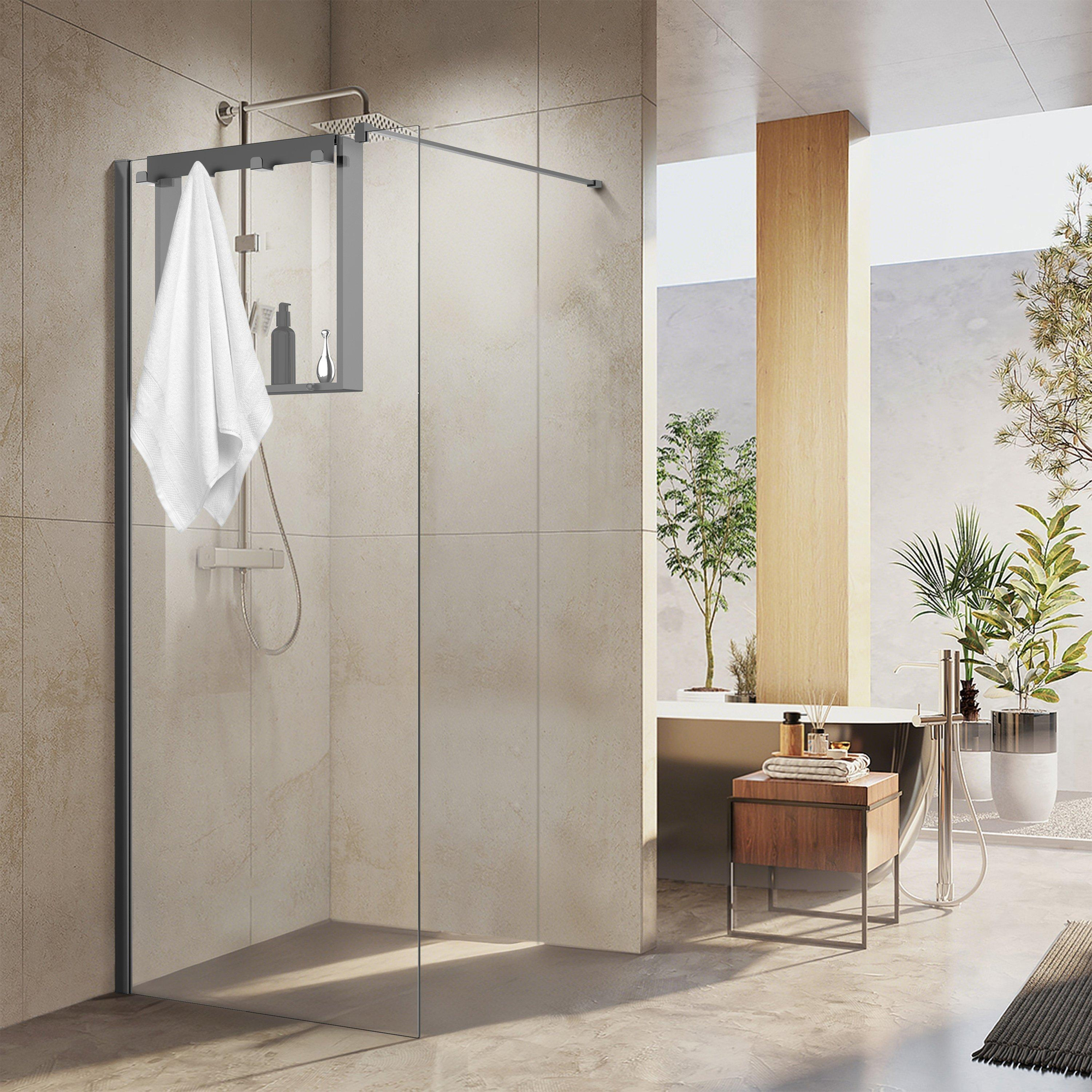 Cette tablette intelligente avec crochets est LA solution si vous souhaitez plus d’espace de rangement dans la douche sans percer dans le mur ou le carrelage. Idéale aussi bien dans les petites salles de bains que dans les grandes douches à l’italienne où vous voulez conserver flacons, éponges et serviettes de manière ordonnée et à portée de main. La finition gunmetal s’harmonise parfaitement avec les douches modernes aux accents noirs ou en métal foncé, mais se marie aussi très bien avec le chrome ou l’inox intemporels. Grâce à la fixation sur la paroi de douche, vous gardez le sol dégagé et votre douche paraît calme et bien rangée. Si vous recherchez un mélange élégant de design, de fonctionnalité et de facilité d’entretien, cet accessoire est un choix particulièrement pratique.