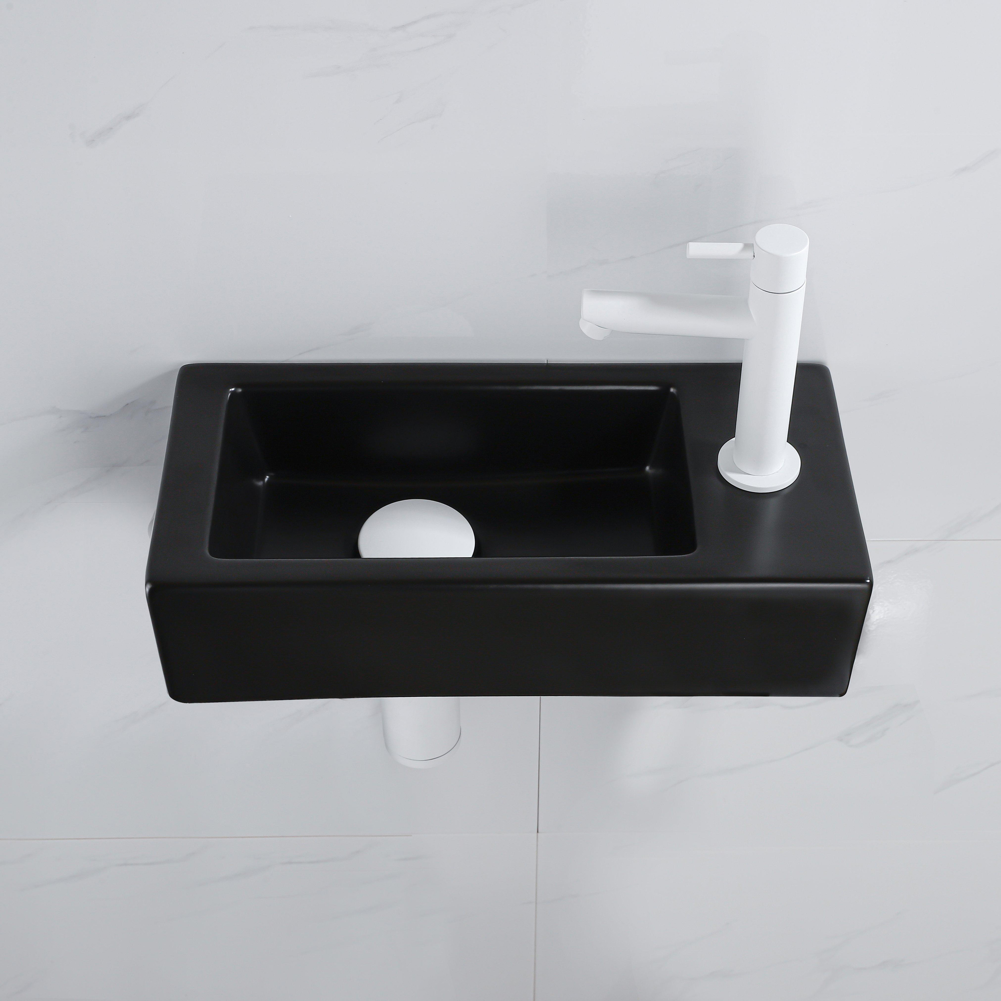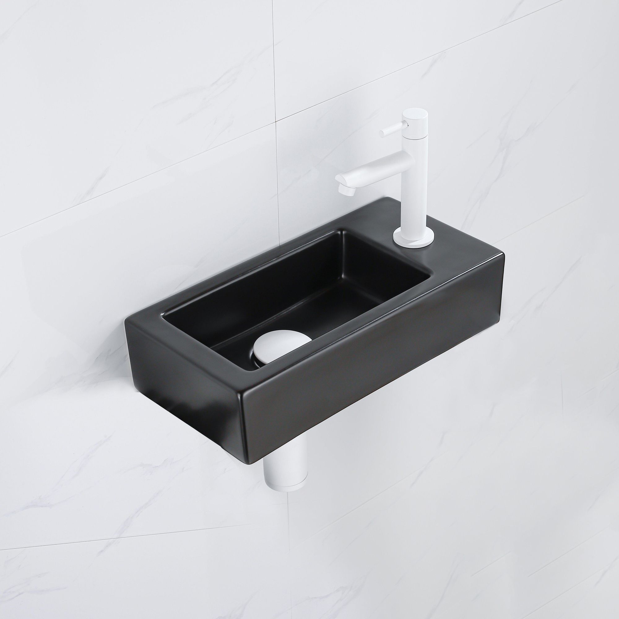 QeramiQ Lave-mains Kit lave-mains - 37.5x18.5x9cm - céramique - trou de robinet à droite - robinet lave-mains mat blanc - bonde de vidage - siphon abaissé - Mat Noir