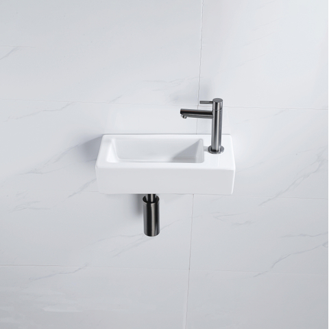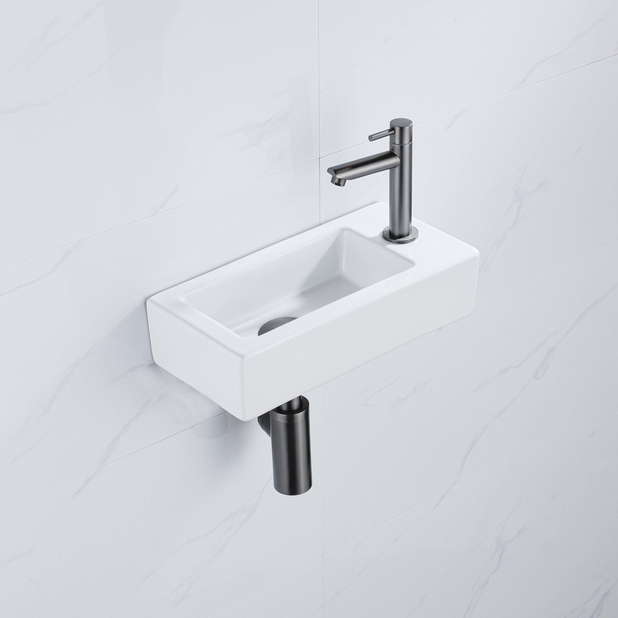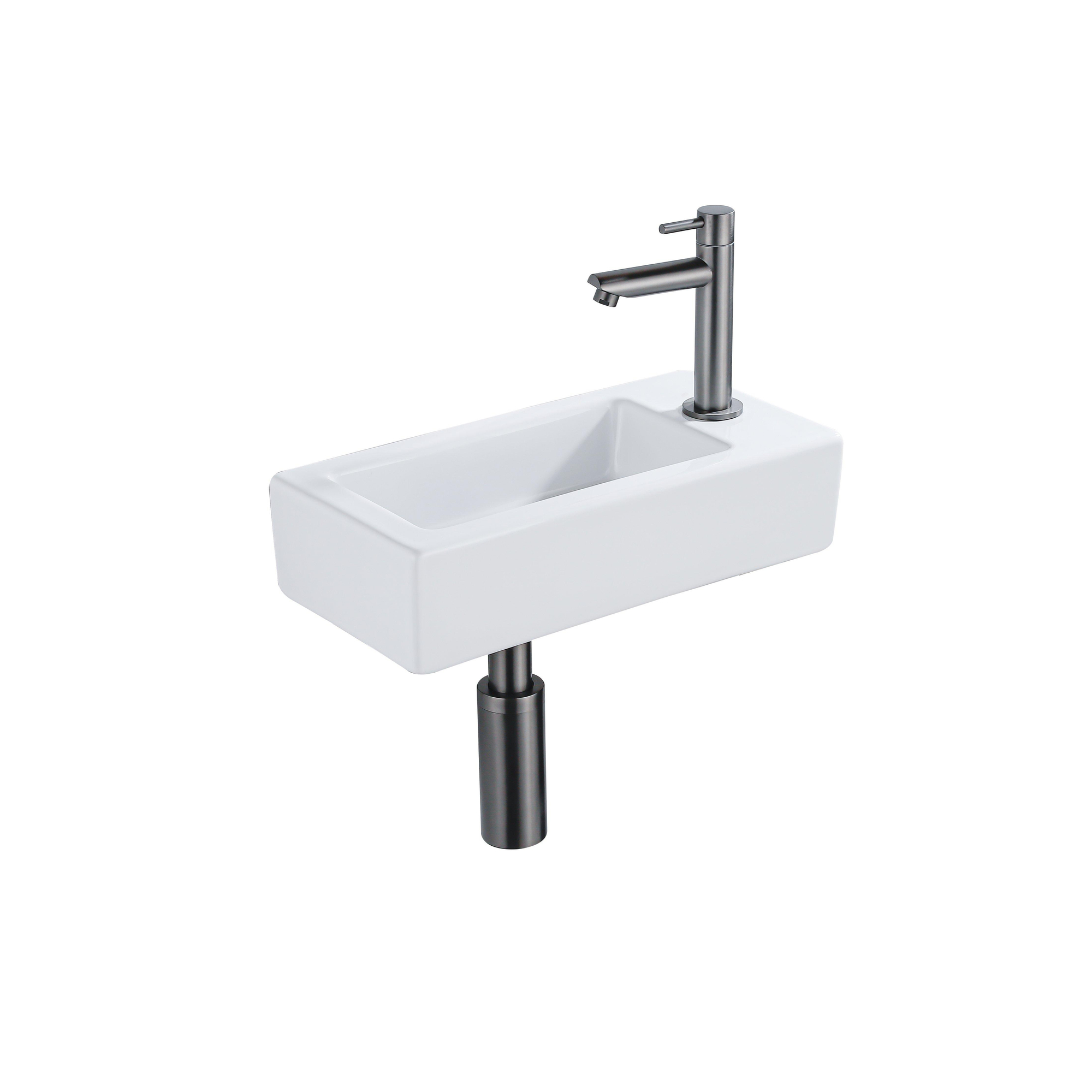 QeramiQ Fuente Ensemble lave-mains - 37.5x18.5x9cm - céramique - trou de robinet à droite - robinet de lave-mains gunmetal - bonde - siphon abaissé - Blanc brillant
