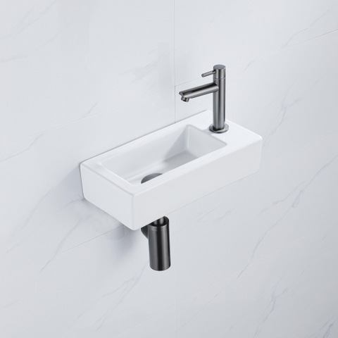 Cet ensemble lave-mains complet est une solution astucieuse pour aménager avec style un petit WC ou une salle de bains compacte, sans sacrifier le confort. Grâce à son format fin de 37,5x18,5x9 cm, vous exploitez de manière optimale l’espace disponible, même dans un espace WC étroit ou sous un toit en pente. La céramique brillante offre un aspect frais et hygiénique, tandis que la combinaison avec un robinet de lave-mains foncé apporte une touche moderne qui s’intègre parfaitement aux salles de bains contemporaines, aux intérieurs industriels ou à une ambiance scandinave épurée. Comme le trou de robinet, le robinet, la bonde et le siphon abaissé sont déjà assortis, vous n’avez plus à vous creuser la tête : vous avez immédiatement tout ce qu’il faut pour une solution propre et pratique près des toilettes ou à l’entrée.