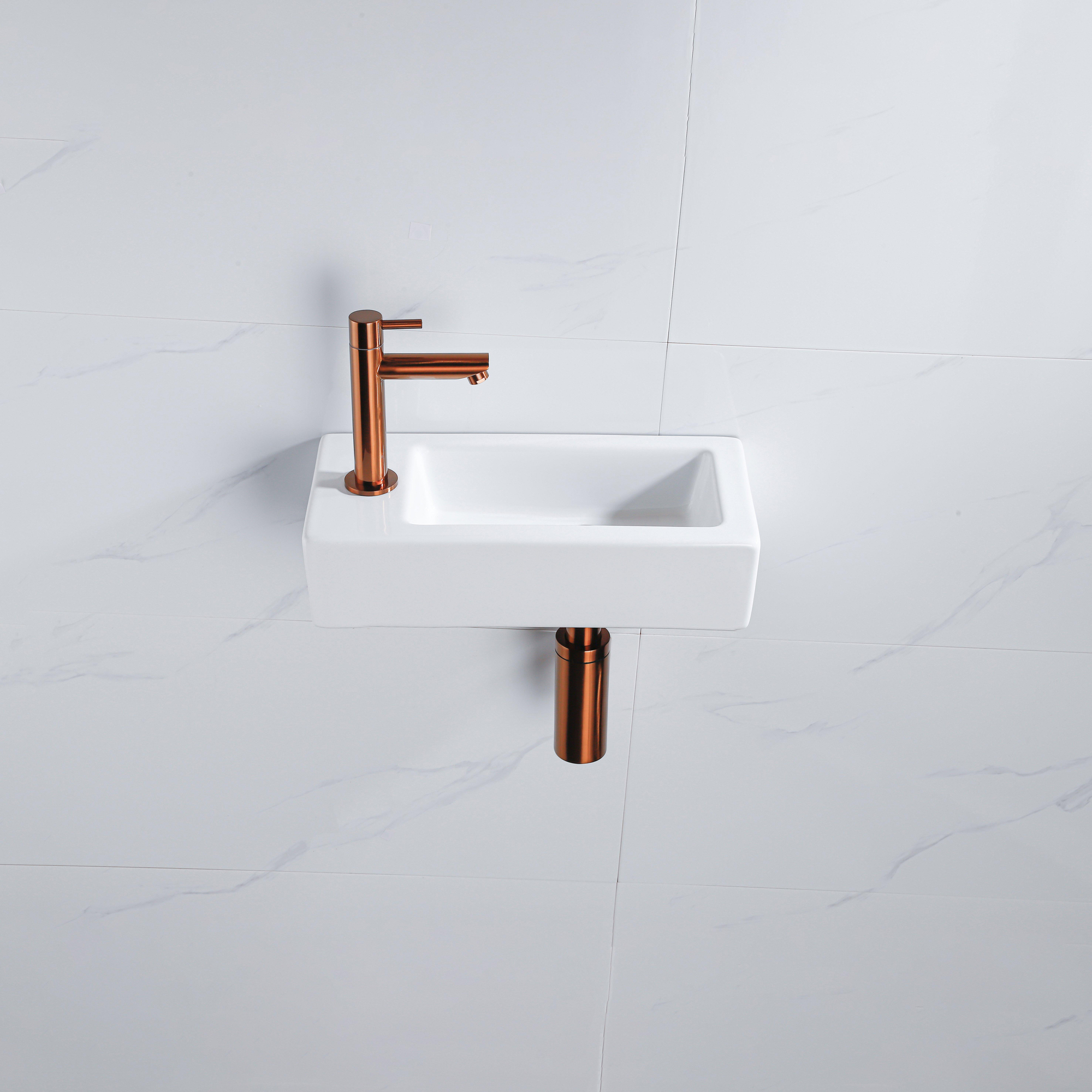 Le QeramiQ Fuente Kit lave-mains dégage du luxe avec sa céramique blanche brillante et son robinet lave-mains en cuivre brossé. Ce kit de lave-mains ajoute une touche d'élégance à chaque salle de bain. Le trou de robinet à gauche permet un écoulement d'eau sans effort, tandis que le siphon abaissé et la bonde de vidage assurent un drainage efficace. Avec ses dimensions de 37.5x18.5x9cm, ce kit de lave-mains s'intègre parfaitement dans les petits espaces et est idéal pour les salles de bains pour invités ou les toilettes.