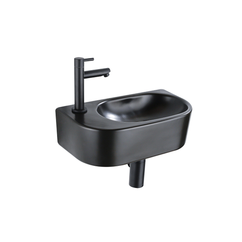 QeramiQ Fuente Ensemble de lavabo - 40x21.5x12cm - gauche - lisse - demi-rond - 1 trou de robinet - céramique - robinet de fontaine noir mat - bouchon de vidange - siphon abaissé - noir mat