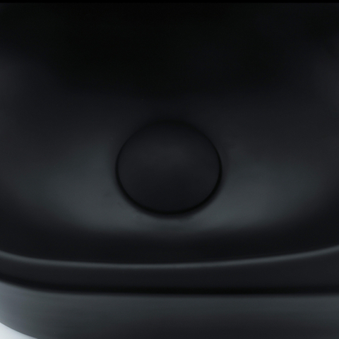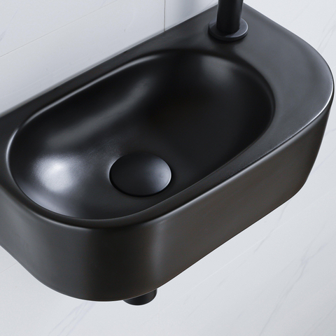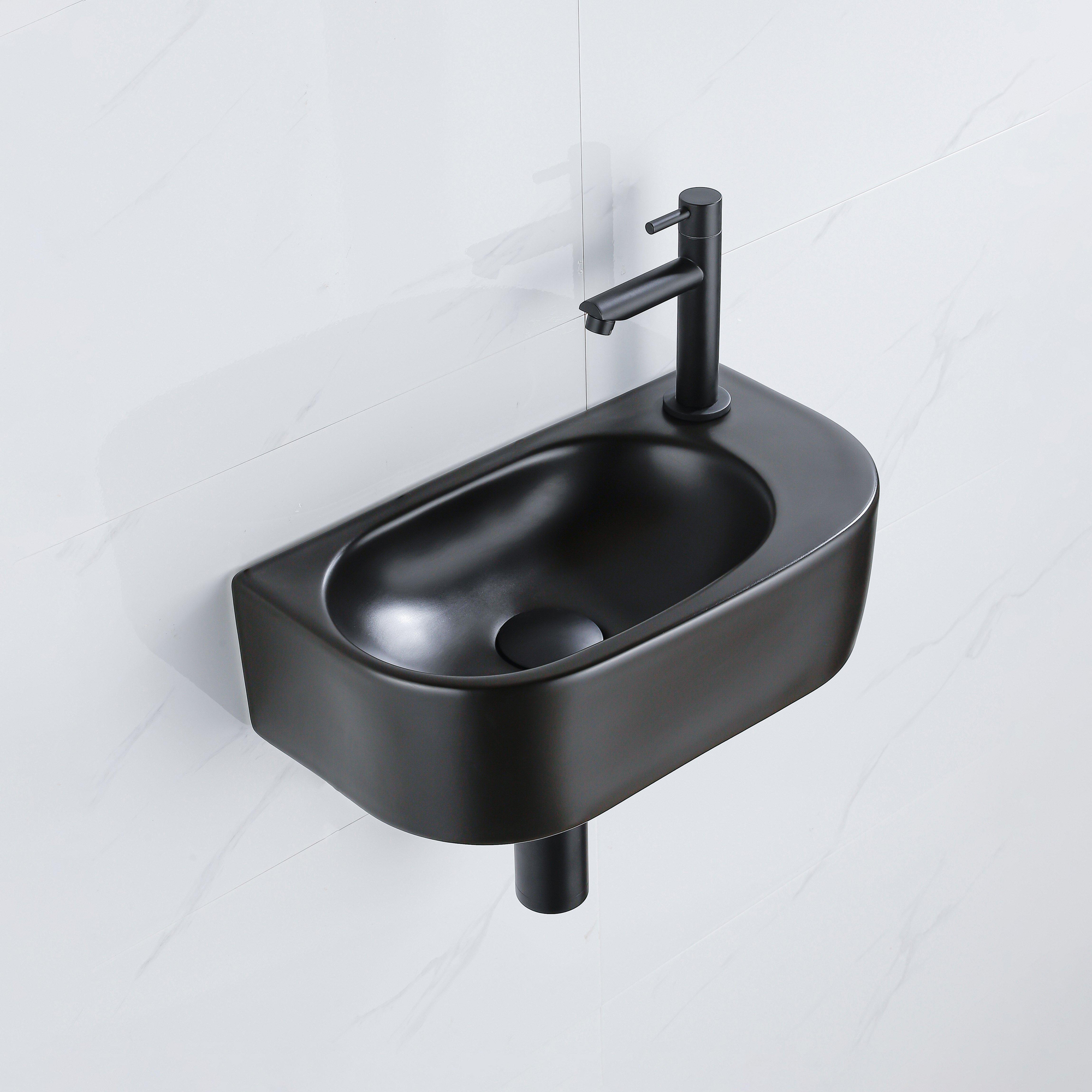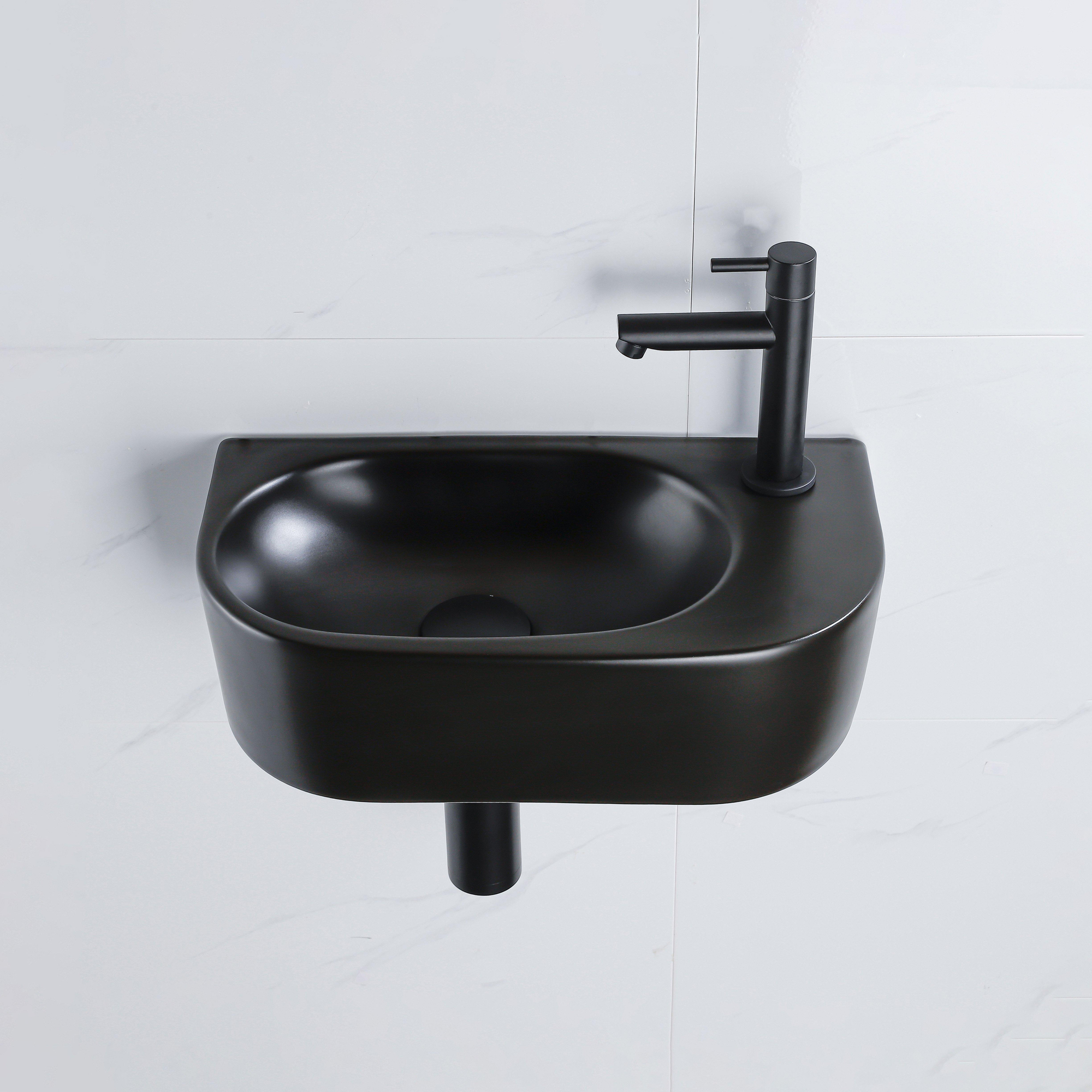 QeramiQ Fuente Ensemble de lavabo - 40x21.5x12cm - droit - lisse - demi-rond - 1 trou de robinet - céramique - robinet de lave-mains noir mat - bouchon de vidange - siphon abaissé - noir mat