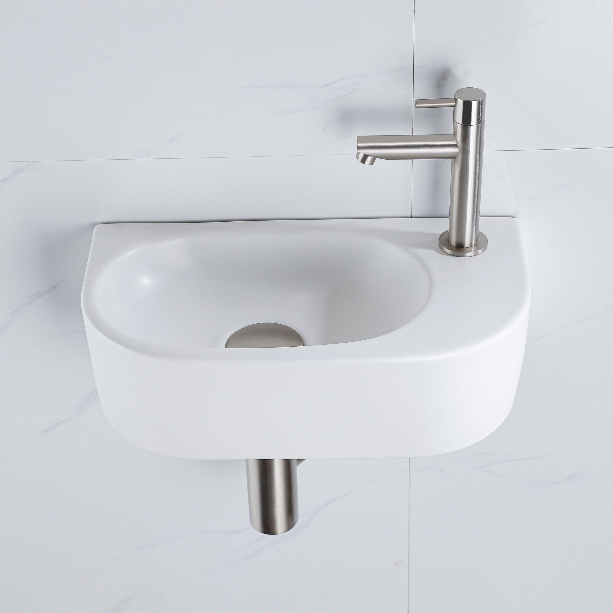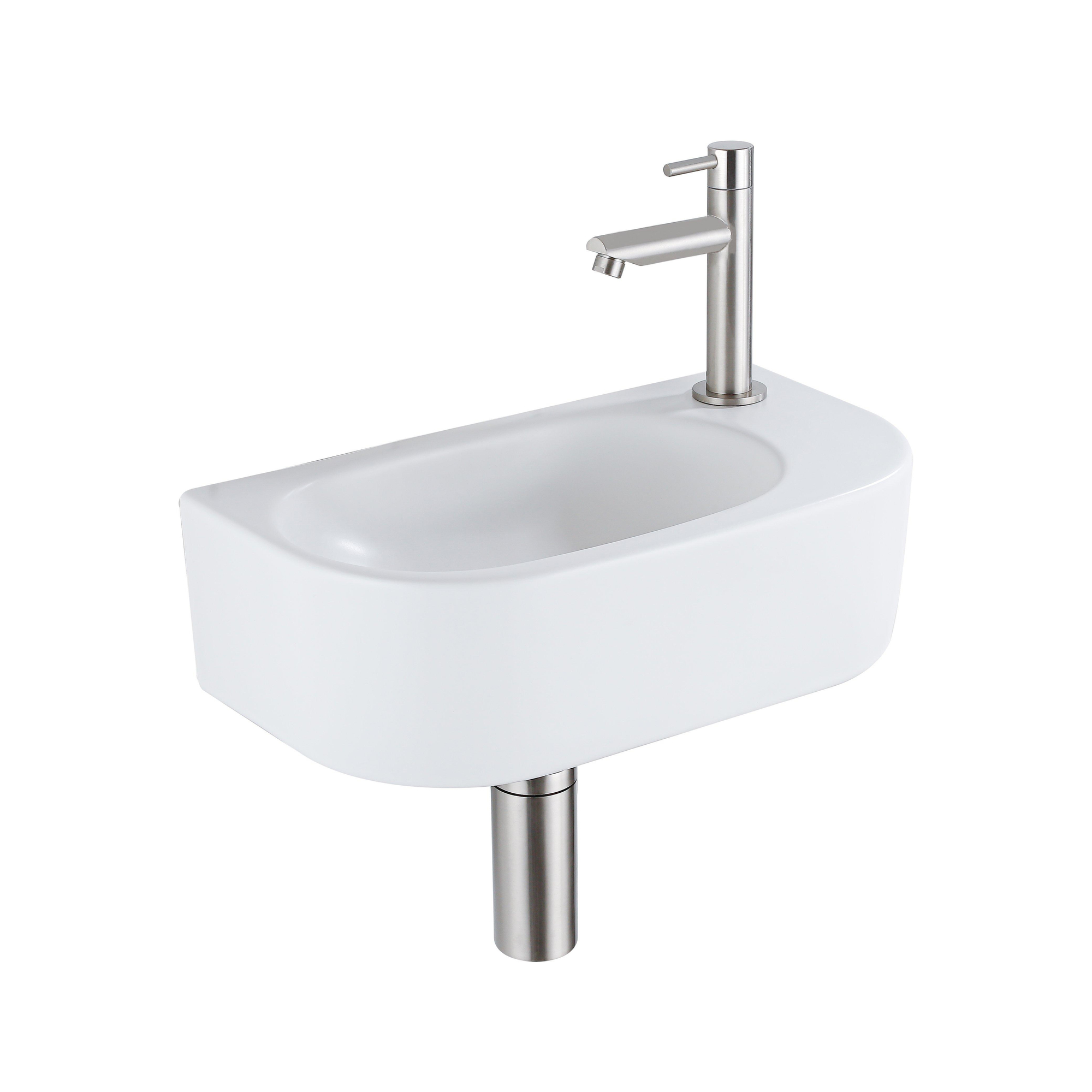 QeramiQ Fuente Ensemble lave-mains - 40x21.5x12cm - droite - lisse - semi-circulaire - 1 trou de robinet - céramique - robinet de lave-mains inox brossé - bonde - siphon abaissé - blanc mat
