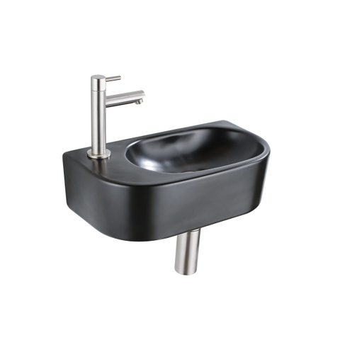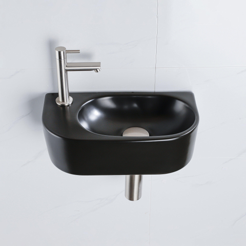 QeramiQ Fuente Ensemble lave-mains - 40x21,5x12cm - gauche - lisse - semi-circulaire - 1 trou de robinet - céramique - robinet de lavabo en inox brossé - bonde - siphon abaissé - noir mat
