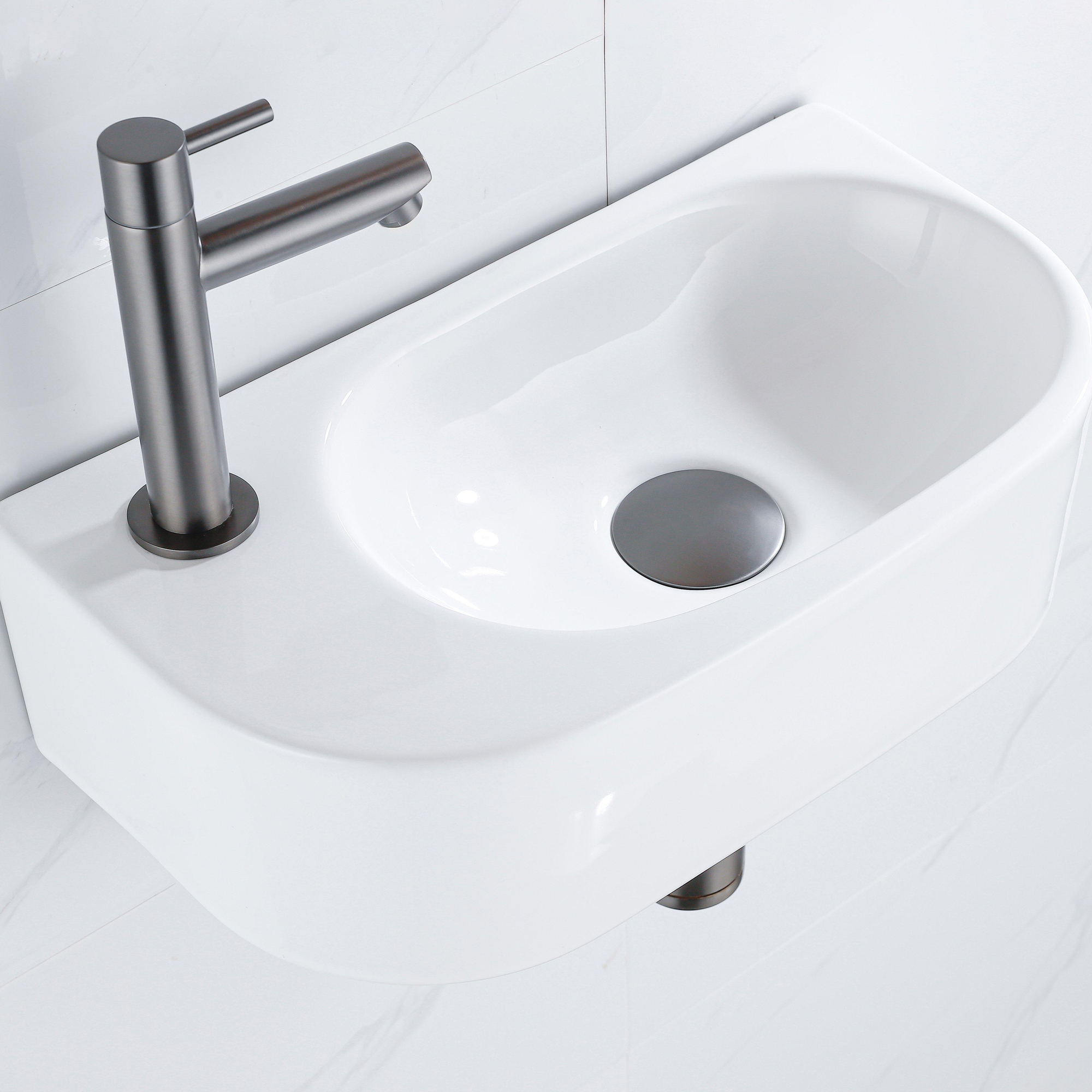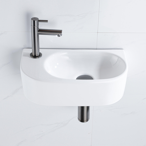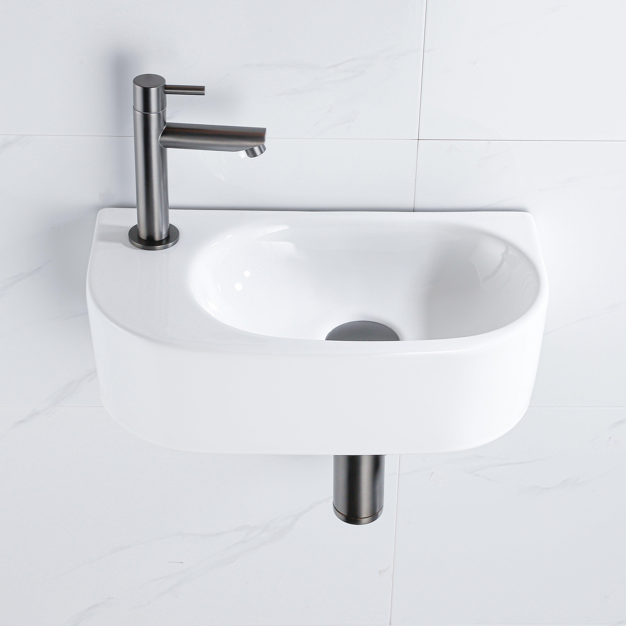 QeramiQ Fuente Ensemble de lavabo - 40x21.5x12cm - gauche - lisse - demi-rond - 1 trou de robinet - céramique - robinet de lave-mains gunmetal - bouchon de vidange - siphon abaissé - blanc brillant