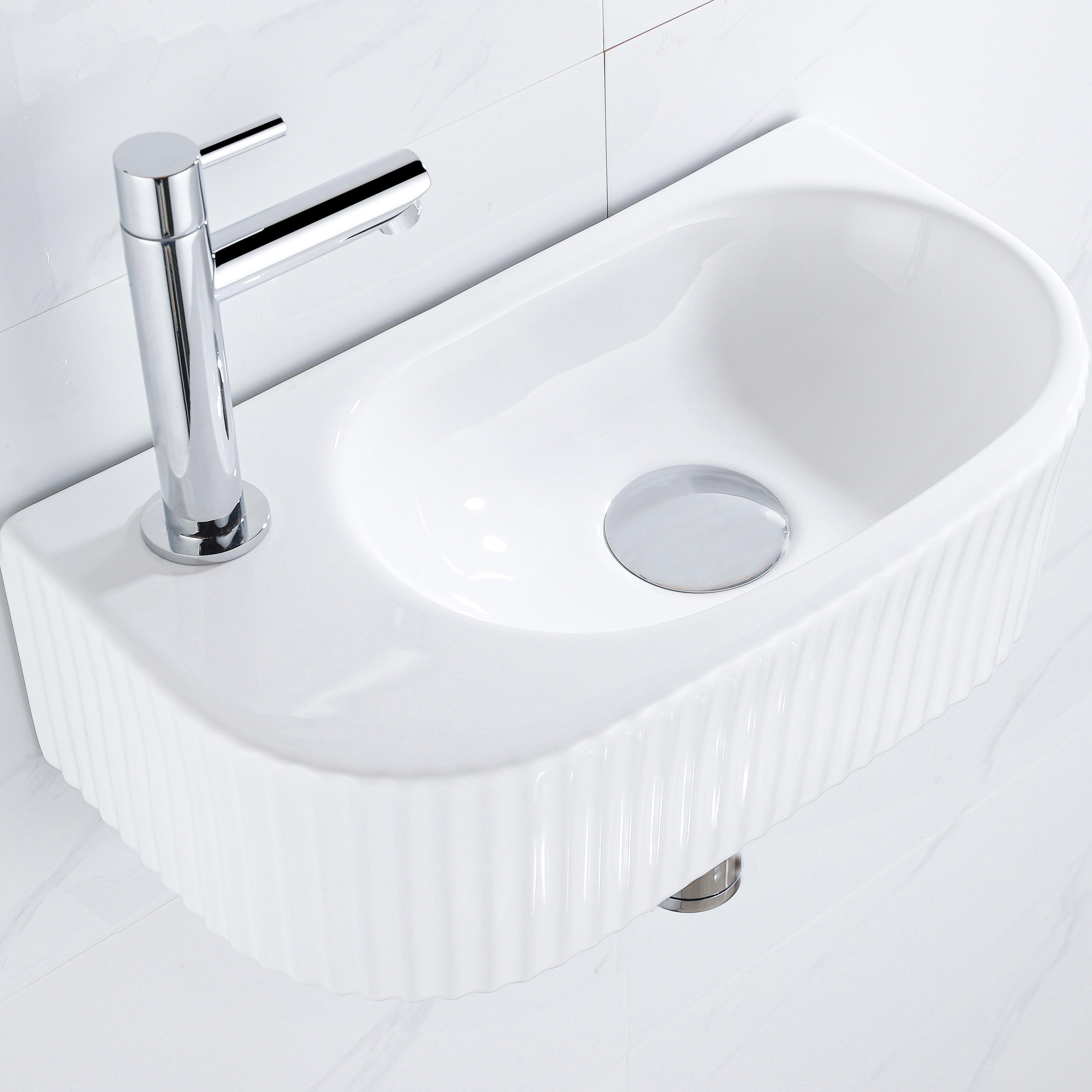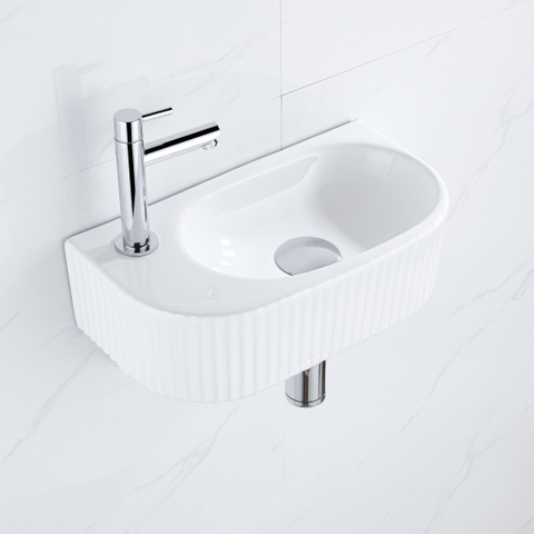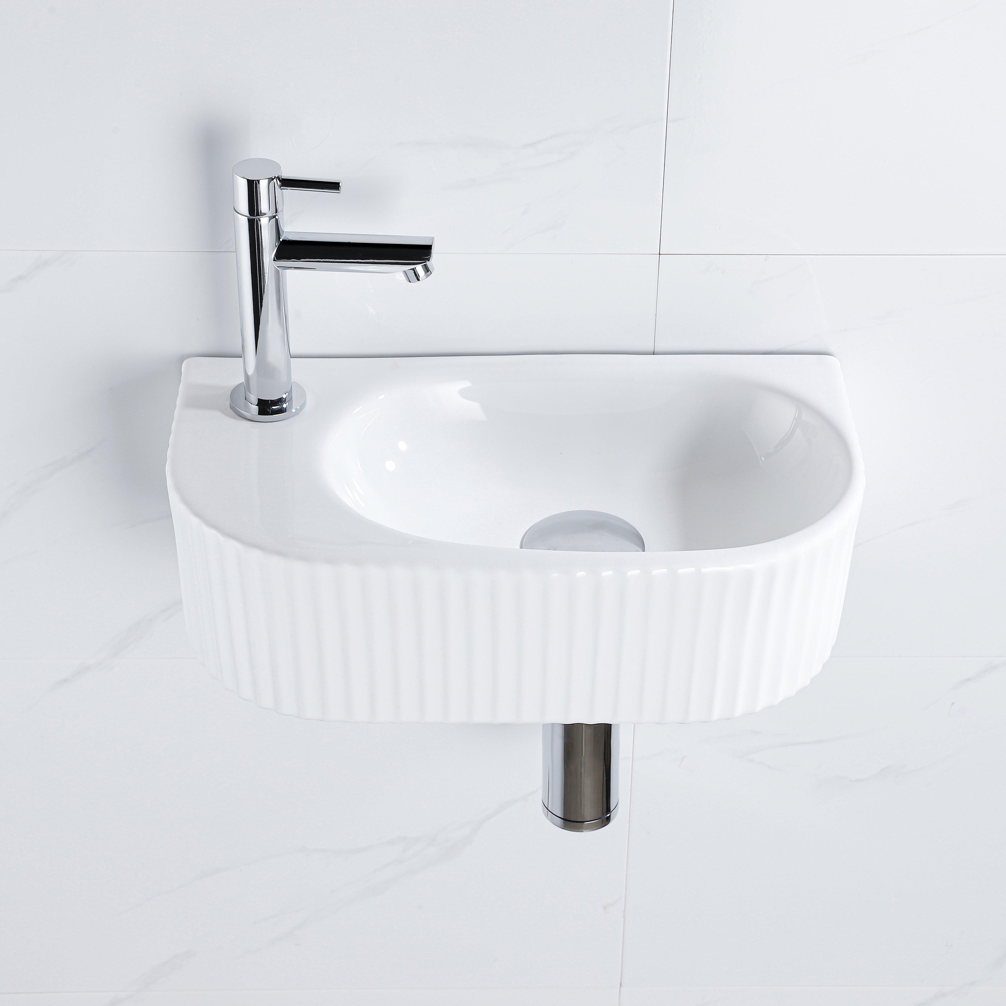 QeramiQ Fuente Ensemble de lave-mains - 40x21.5x12cm - gauche - cannelé - demi-rond - 1 trou de robinet - céramique - robinet de lavabo chromé - bouchon de vidage - siphon abaissé - blanc brillant