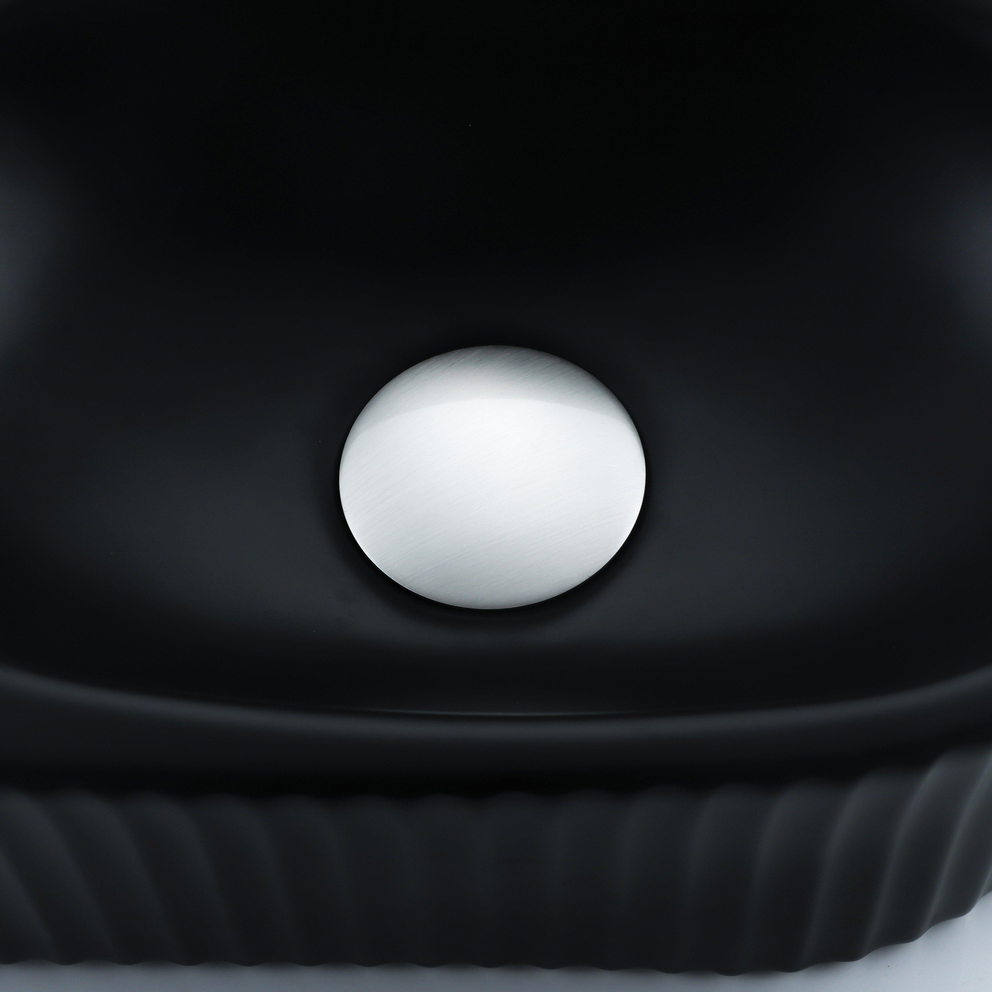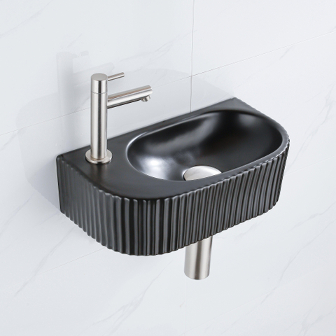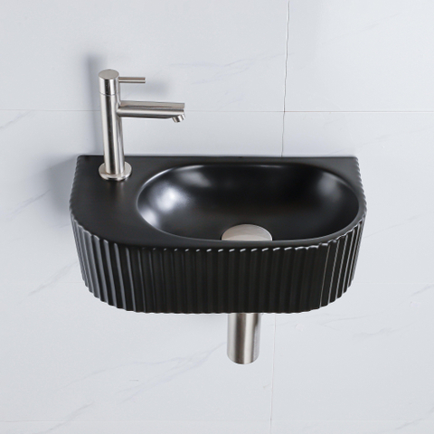 QeramiQ Fuente Ensemble de lavabo - 40x21.5x12cm - gauche - nervuré - demi-rond - 1 trou de robinet - céramique - robinet de lavabo acier inoxydable brossé - bouchon de vidange - siphon abaissé - noir mat