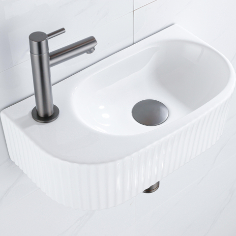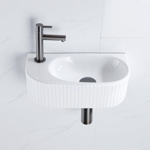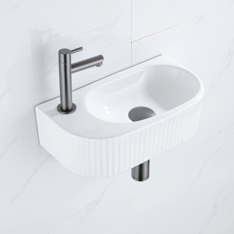 QeramiQ Fuente Ensemble de lavabo - 40x21.5x12cm - gauche - strié - demi-rond - 1 trou de robinet - céramique - robinet de lave-mains gunmetal - bouchon de vidange - siphon abaissé - blanc brillant