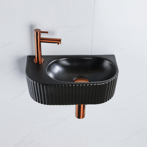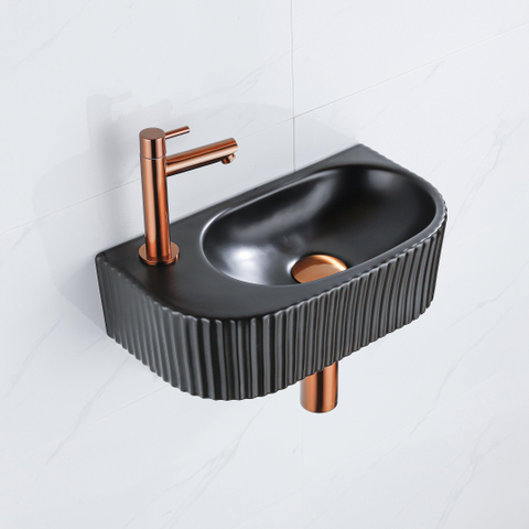 QeramiQ Fuente Ensemble lave-mains - 40x21.5x12cm - gauche - nervuré - semi-circulaire - 1 trou de robinet - céramique - robinet de lave-mains cuivre brossé - bonde - siphon réduit - noir mat