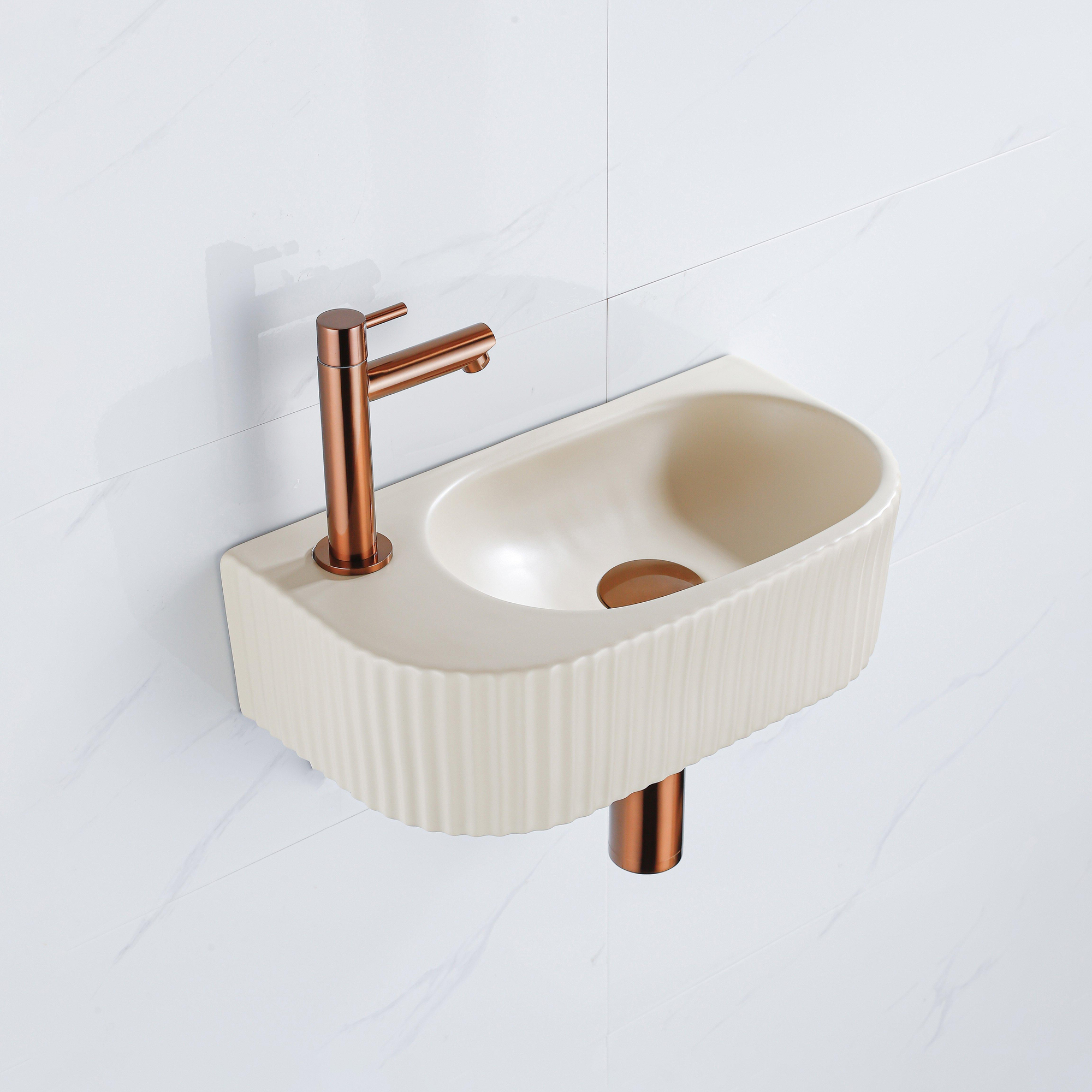 QeramiQ Fuente Ensemble de lavabo - 40x21.5x12cm - gauche - nervuré - demi-rond - 1 trou de robinet - céramique - robinet de lave-mains cuivre brossé - bouchon de vidange - siphon abaissé - beige