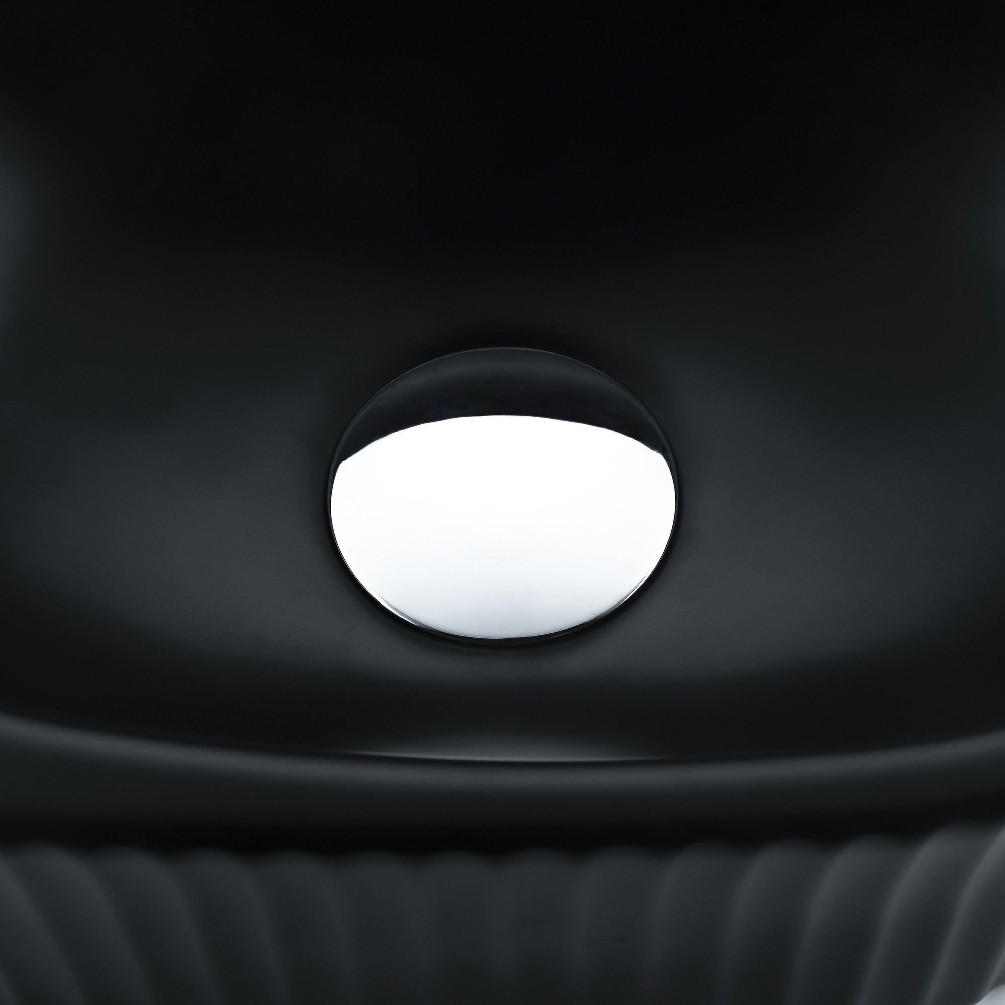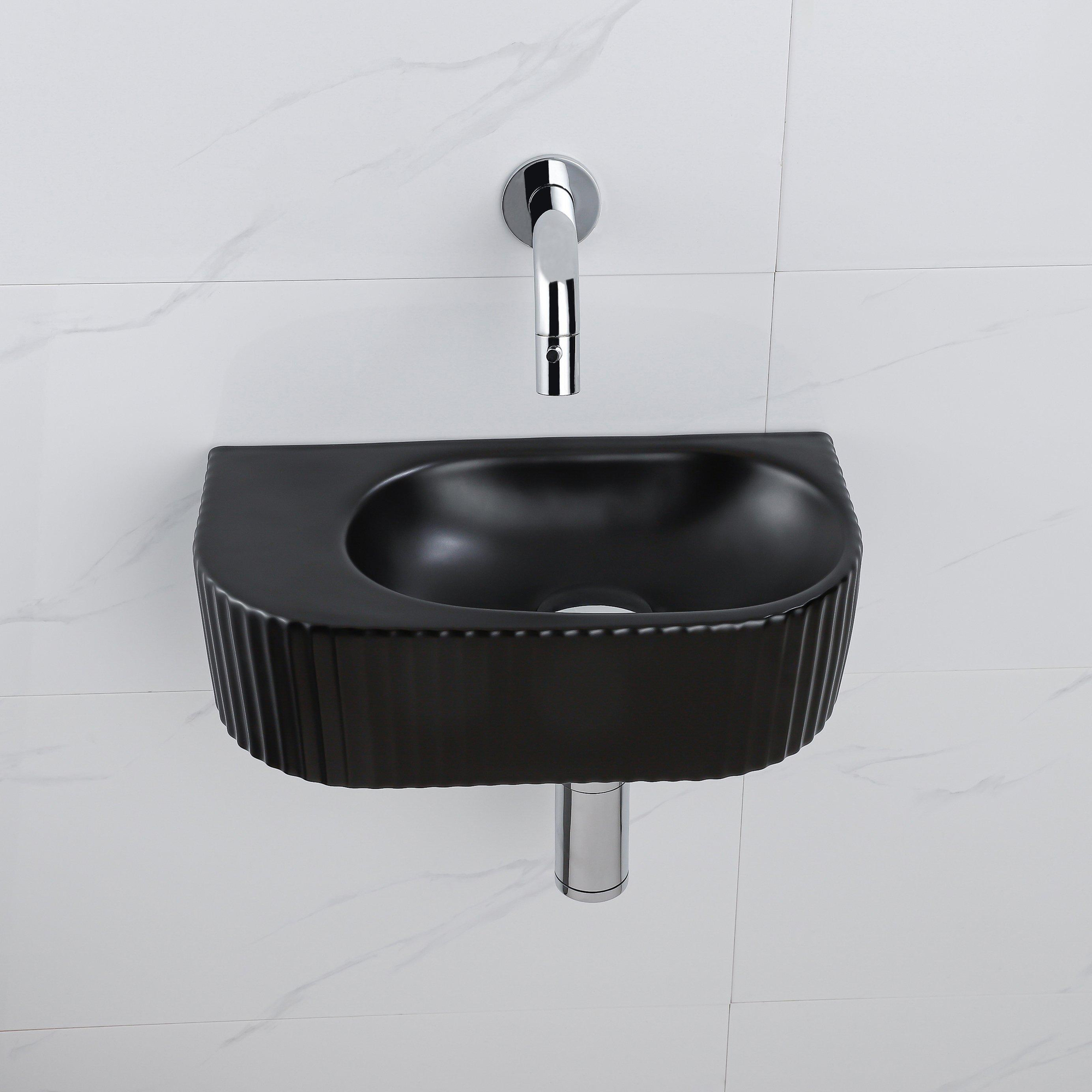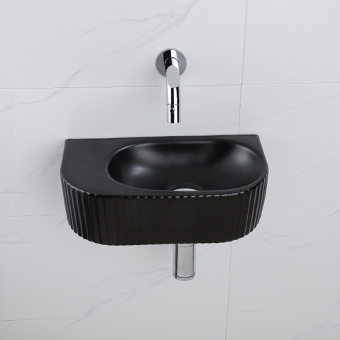 QeramiQ Fuente Ensemble de Lavabo - 40x21.5x12cm - strié - demi-rond - céramique - ensemble de robinet chrome - bouchon de vidange - siphon réduit - noir mat