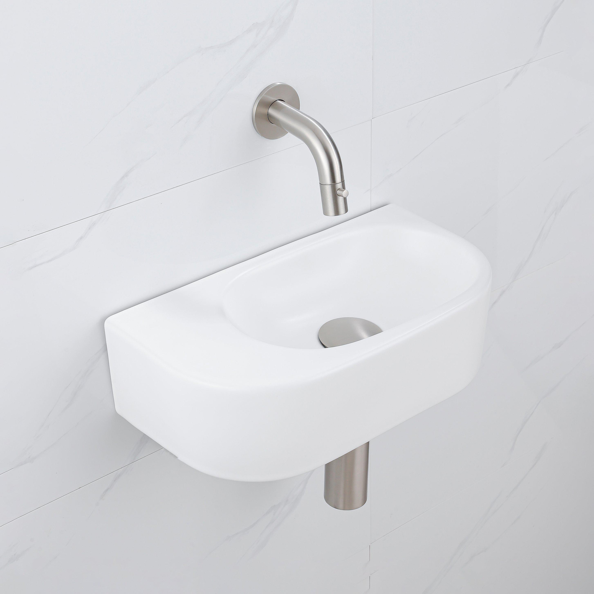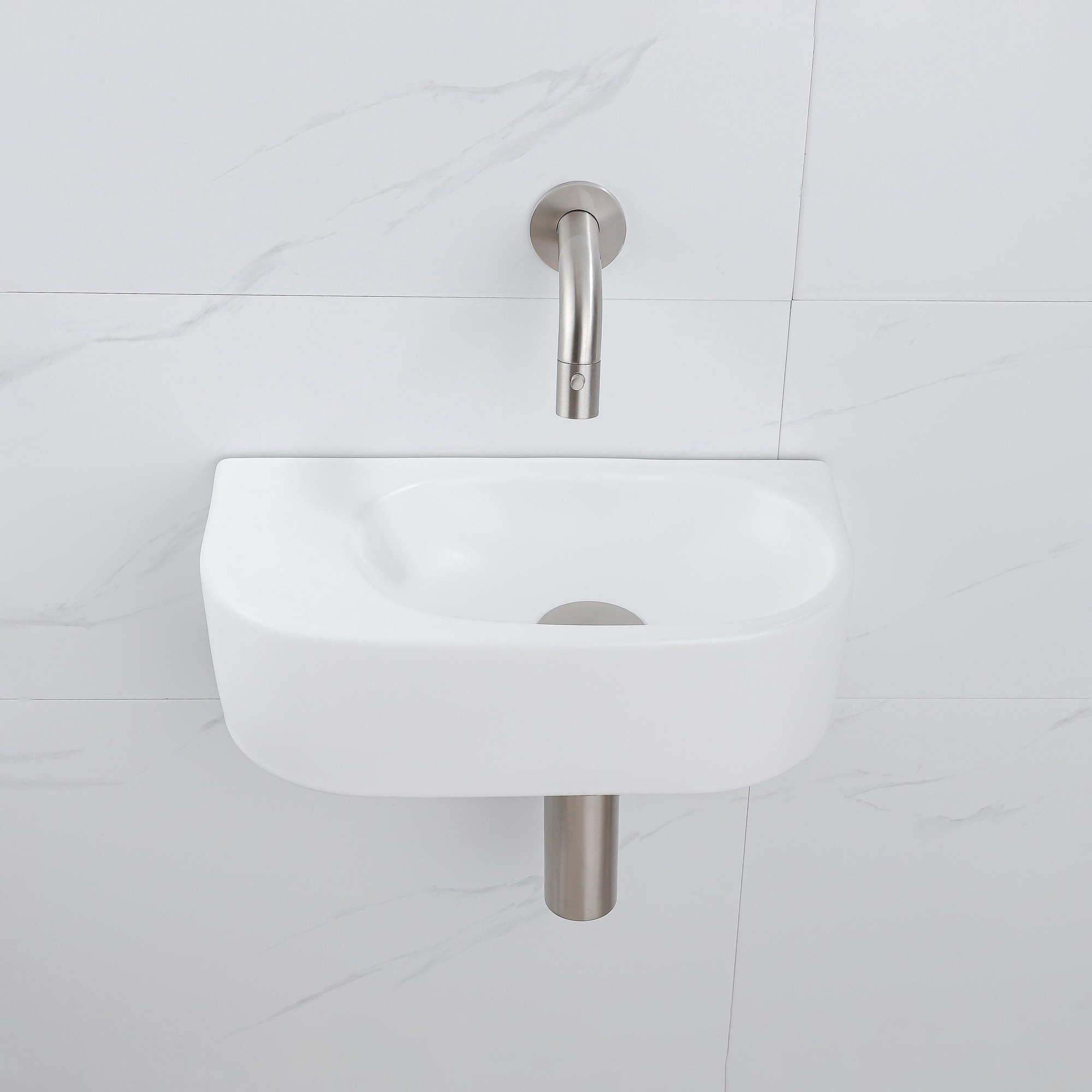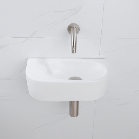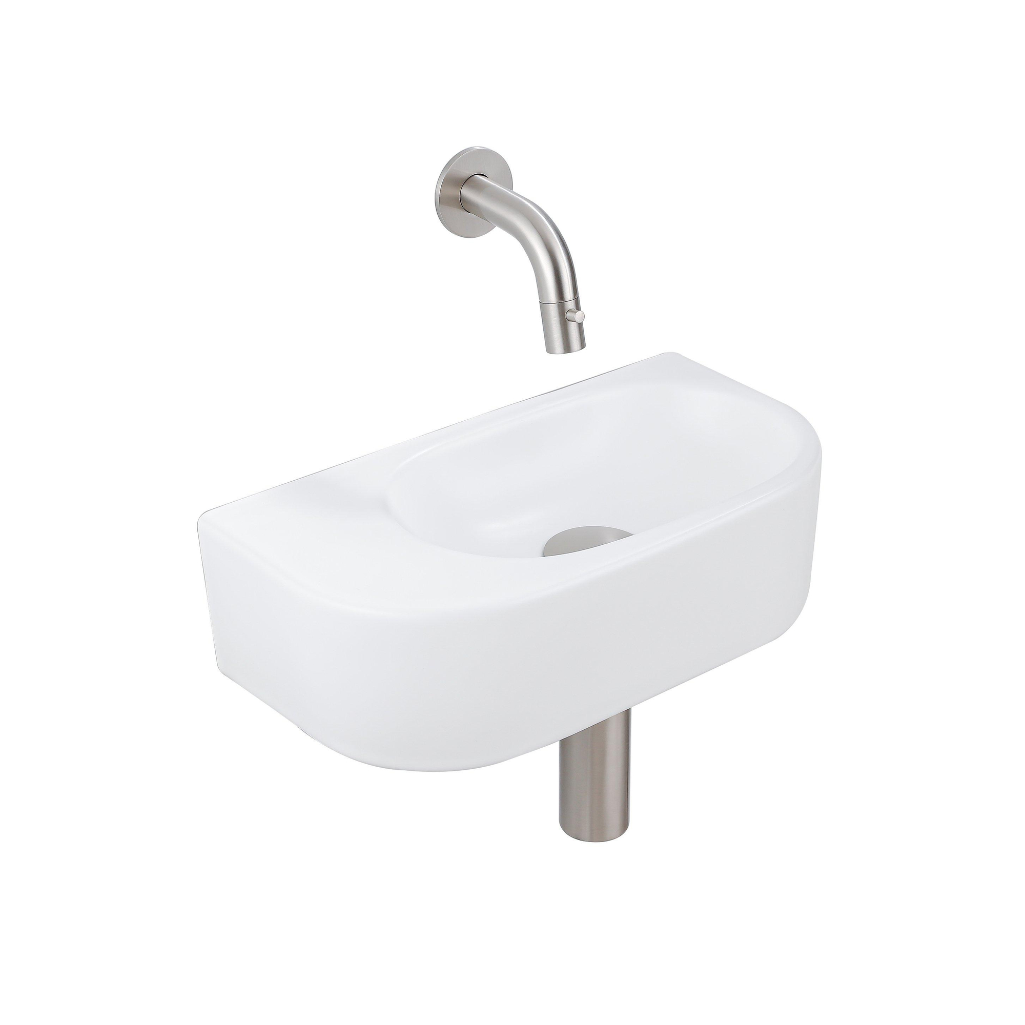 QeramiQ Fuente Ensemble de Lavabo - 40x21.5x12cm - lisse - demi-rond - céramique - ensemble de robinet en acier inoxydable brossé - bouchon de vidange - siphon abaissé - blanc mat