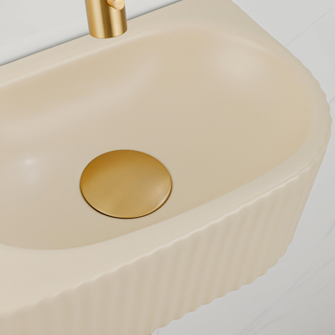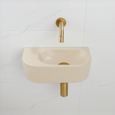 QeramiQ Fuente Ensemble de Lavabo - 40x21.5x12cm - strié - demi-rond - sans trou pour robinet - céramique - ensemble de robinet en laiton brossé - bouchon de vidange - siphon réduit - beige