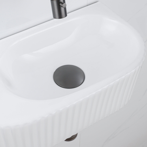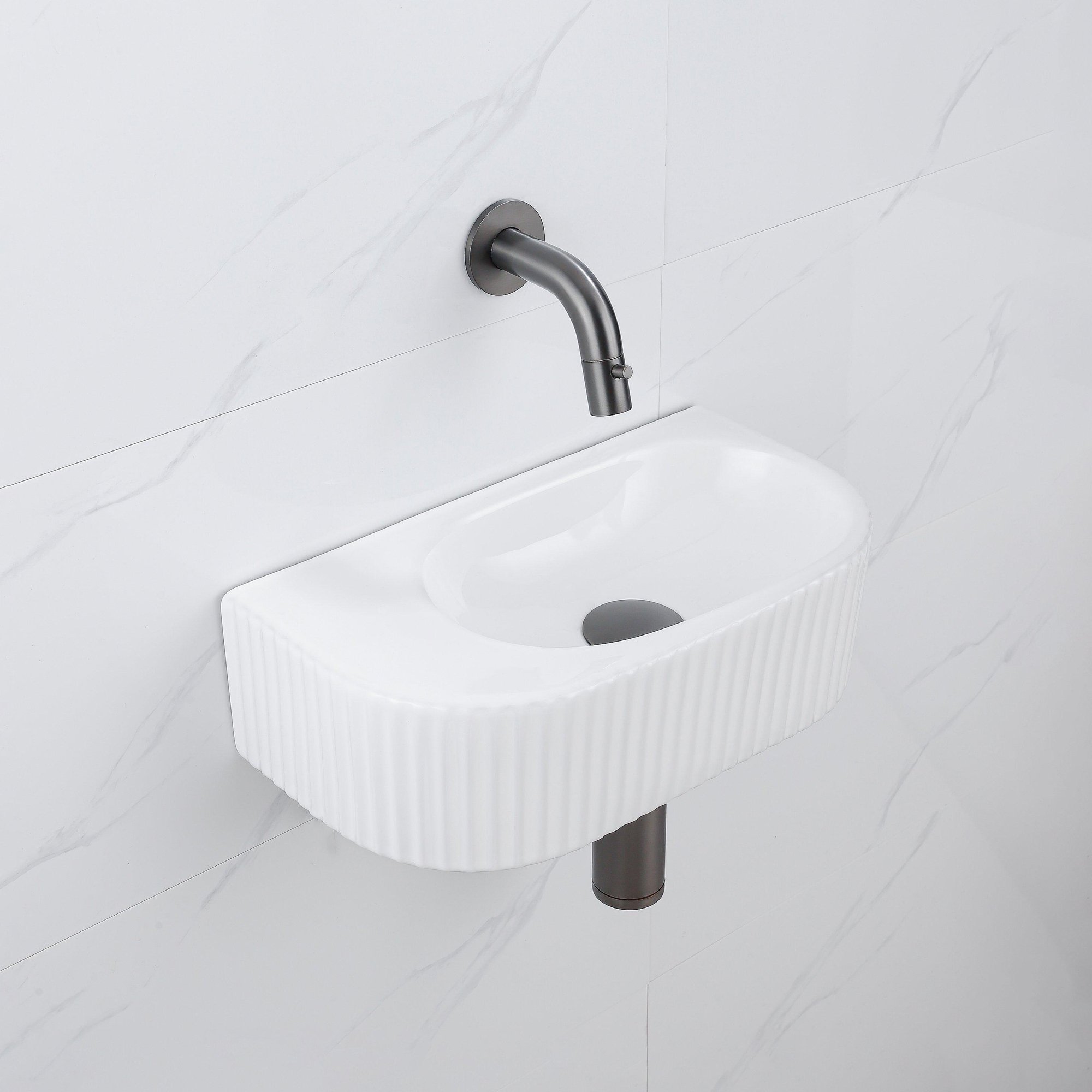 Laissez-vous envoûter par l’apparence élégante de cet ensemble de lave-mains. Le design demi‑rond cannelé ajoute un élément unique à votre salle de bains, tandis que le robinet de lave-mains en gunmetal apporte une touche de luxe à l’ensemble. La finition blanche brillante assure un aspect frais et moderne qui fait passer votre salle de bains au niveau supérieur.