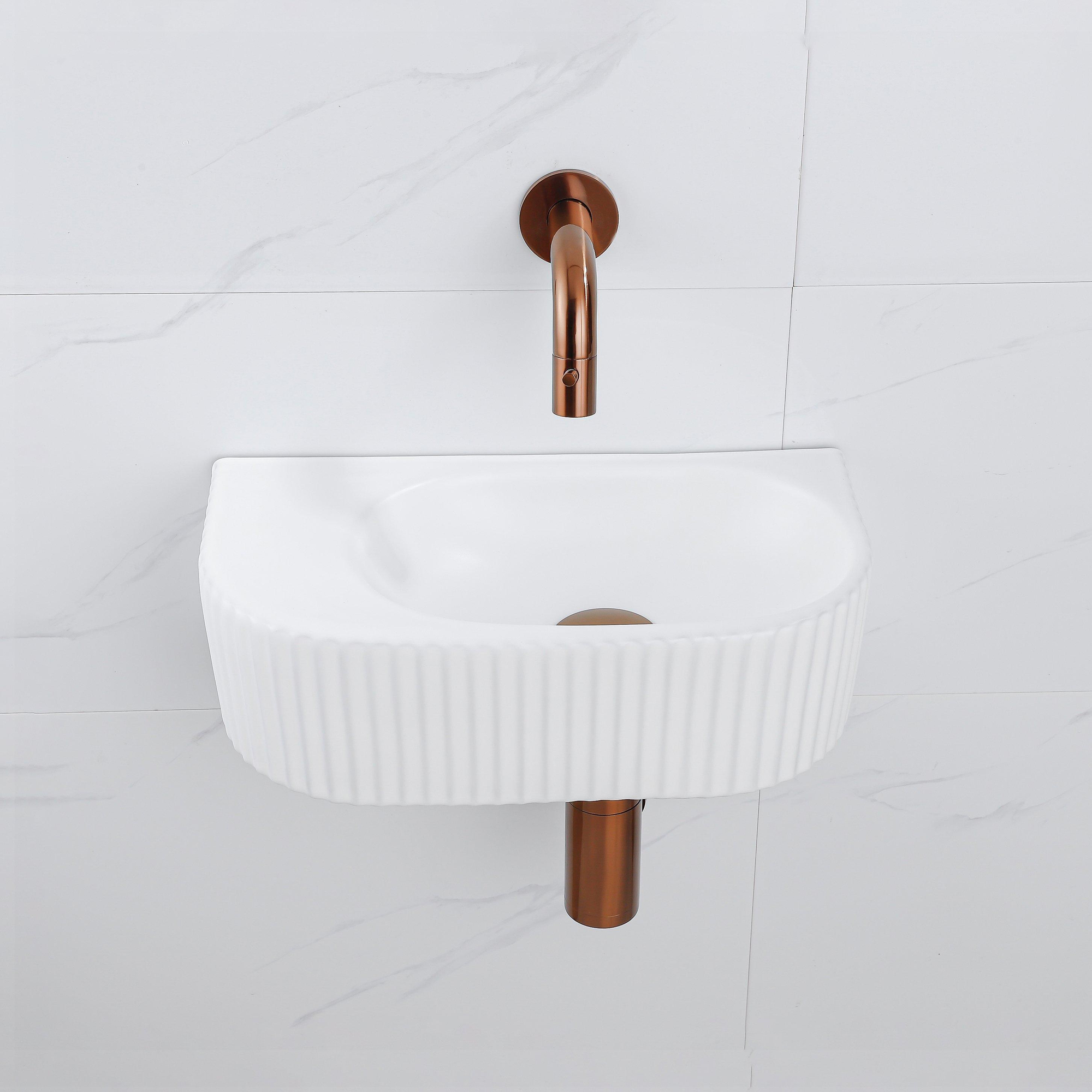 QeramiQ Fuente Ensemble de Lavabo - 40x21.5x12cm - strié - demi-rond - céramique - ensemble de robinet en cuivre brossé - bouchon de vidange - siphon abaissé - blanc mat