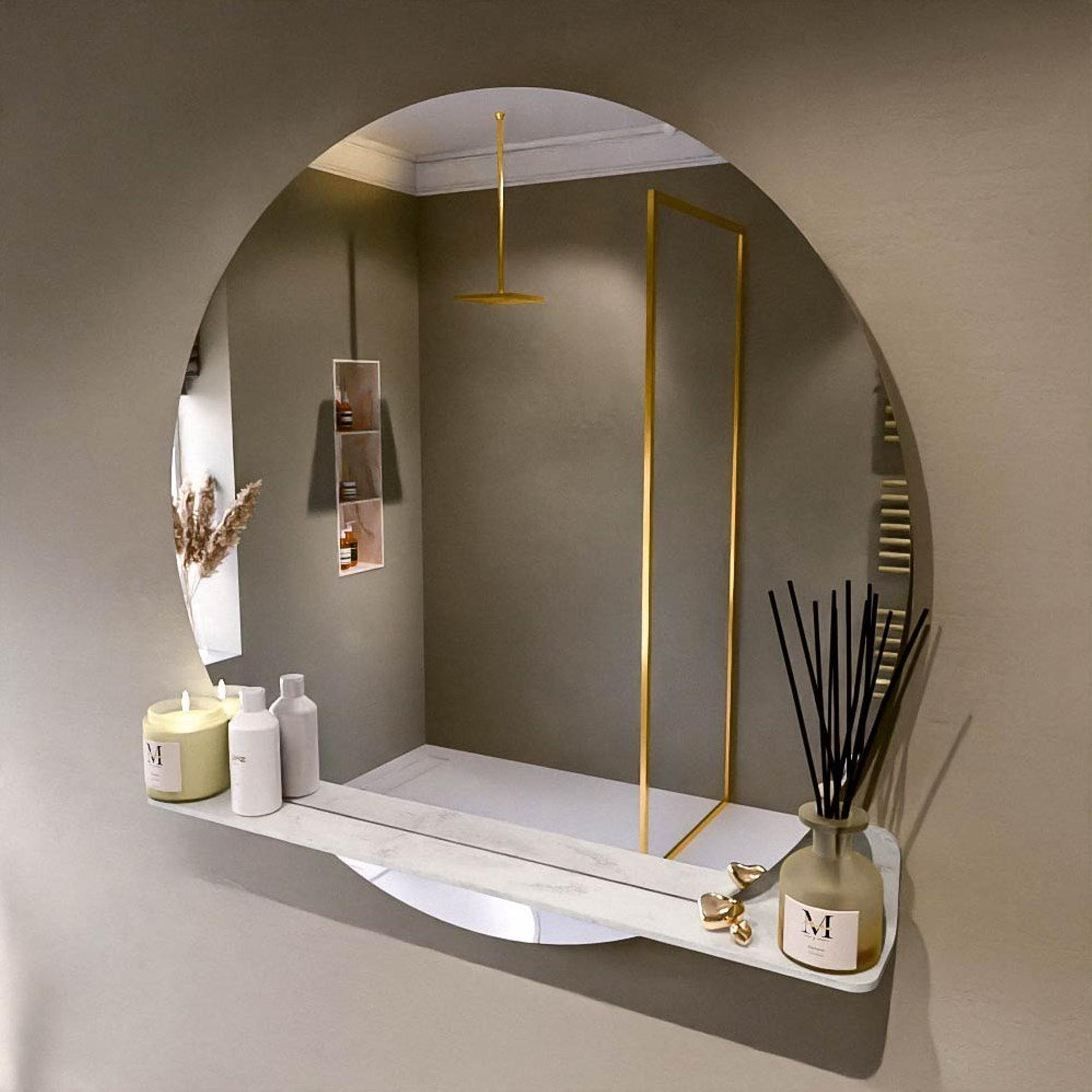 La forme ronde de ce miroir donne immédiatement à votre salle de bains une apparence plus douce et plus accueillante. Pas de lignes dures, mais un cercle fluide qui respire le calme et l’espace. Le miroir encastré est joliment intégré à la tablette, créant ainsi un ensemble moderne, presque architectural. La couleur Opalo – un blanc mat et doux – fonctionne comme une base neutre qui se combine parfaitement avec des salles de bains aussi bien claires que sombres. Ce design convient donc tout aussi bien à un meuble-lavabo blanc qu’à un meuble aspect bois ou noir. De plus, grâce à la dimension généreuse de 100 cm, une atmosphère d’hôtel luxueux se dégage, tandis que le miroir reste pratique pour une utilisation quotidienne par plusieurs membres de la famille.