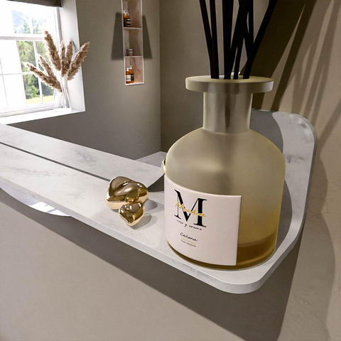 Le bord du miroir et la tablette sont en solid surface, un matériau haut de gamme que vous connaissez peut-être grâce aux plans de travail et lavabos de luxe. Ce matériau est lisse et chaud au toucher, a un aspect épuré et présente une finition mate raffinée. Le solid surface est réputé pour sa durabilité et sa résistance à l’usure, ce qui le rend particulièrement adapté à une utilisation intensive dans la salle de bains. Les petites taches se nettoient facilement et la surface non poreuse est appréciable d’un point de vue hygiénique. Vous combinez ainsi une apparence luxueuse avec une grande praticité et profitez pendant de nombreuses années d’un miroir qui conserve son beau look épuré.