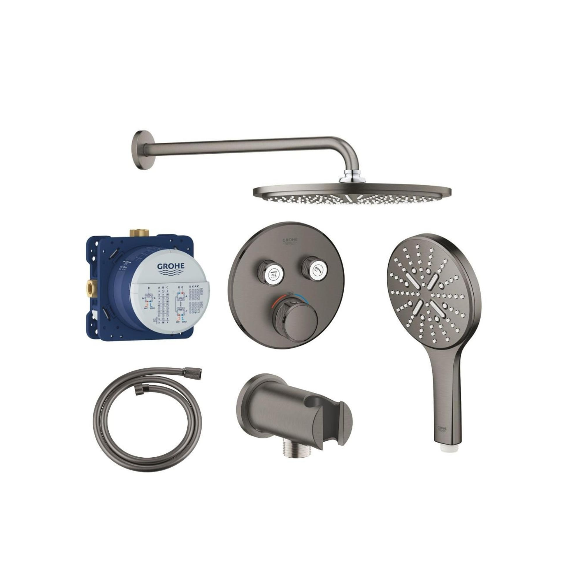 Grohe Grohtherm ensemble de douche de tête encastré - douche de tête ronde - douchette ronde - bras mural courbé - Hard Graphite brossé
