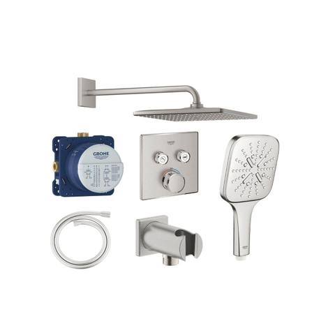 Grohe Grohtherm ensemble de douche de tête encastré - douche de tête carrée - douchette carrée - bras mural courbé - supersteel