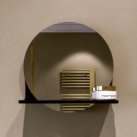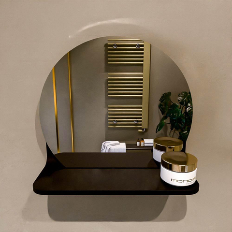 Avec un diamètre de 30 cm et la tablette compacte en dessous, c'est un choix malin si vous ne disposez pas de beaucoup d'espace mural, mais souhaitez tout de même pouvoir vous regarder confortablement dans le miroir. La combinaison du miroir et de la tablette en un seul produit mural évite de devoir monter des étagères ou accessoires séparés, ce qui apporte clarté et sérénité, surtout dans les petites toilettes et salles de bains. La forme ronde permet de positionner facilement le miroir au-dessus d'un petit lave-mains ou lavabo étroit, tandis que vos affaires quotidiennes restent directement à portée de main. Vous créez ainsi un coin lavabo pratique sans que cela paraisse chargé visuellement.