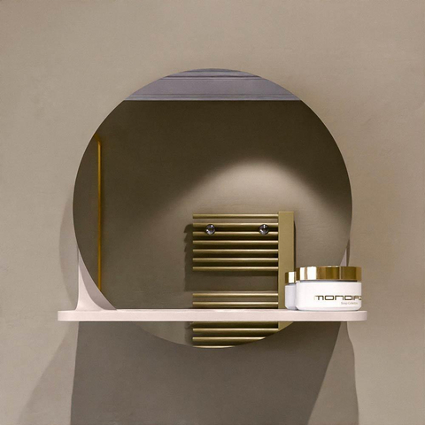 Avec un diamètre de 30 cm, ce miroir mural est suffisamment compact pour des toilettes ou un mur étroit, mais assez grand pour voir confortablement votre visage. La tablette intégrée de 30x12 cm offre juste assez de place pour l'essentiel : un gobelet, un distributeur de savon ou quelques produits favoris. Comme le miroir et la tablette ne forment qu'un seul ensemble, le mur paraît calme et ordonné. Cela rend ce modèle particulièrement adapté si vous recherchez des solutions intelligentes pour une petite salle de bains, ou si vous souhaitez au-dessus d'une fontaine une solution tout-en-un sans devoir installer d'étagères ou d'accessoires supplémentaires.
