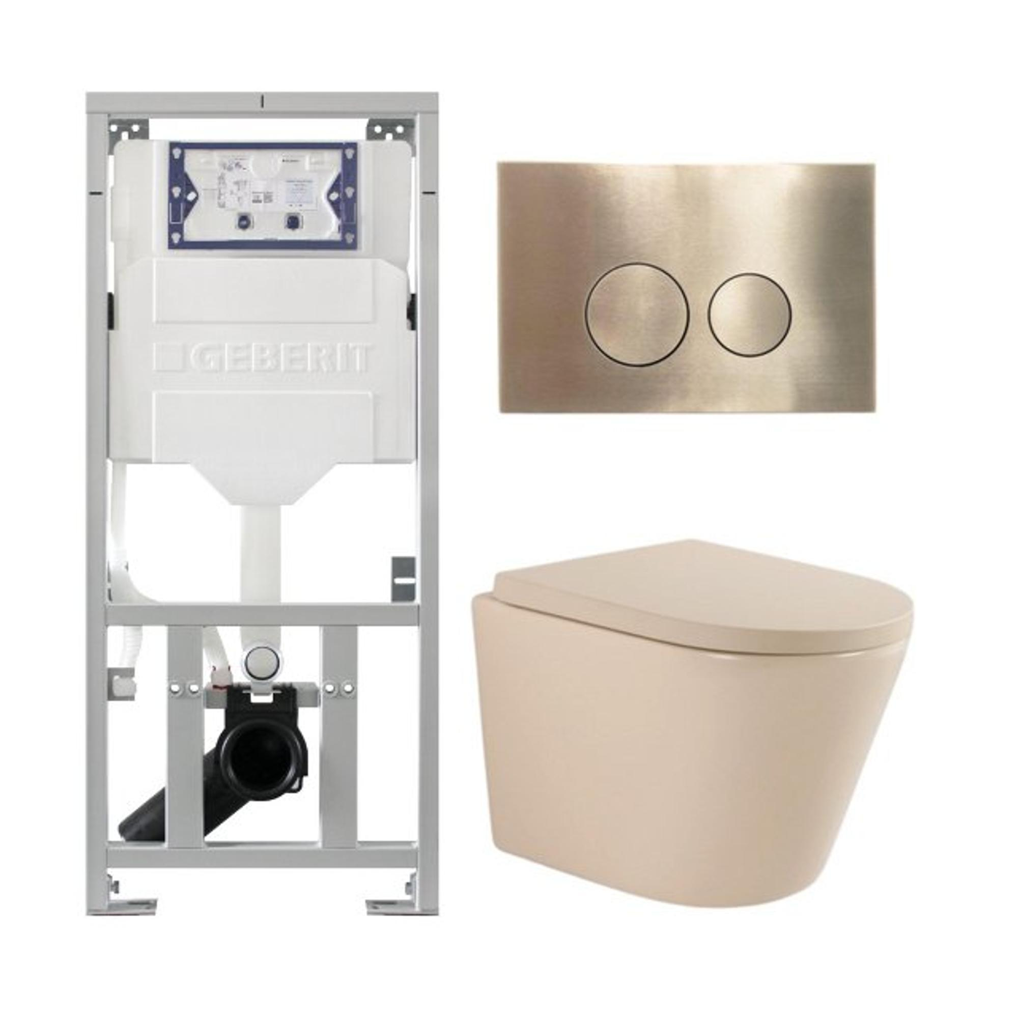QeramiQ Dely Pack WC - 36.3x51.7cm - à fond creux - sans bride - réservoir attenant Geberit UP320 - abattant WC à fermeture douce - plaque de commande en laiton brossé - boutons ronds - mat beige
