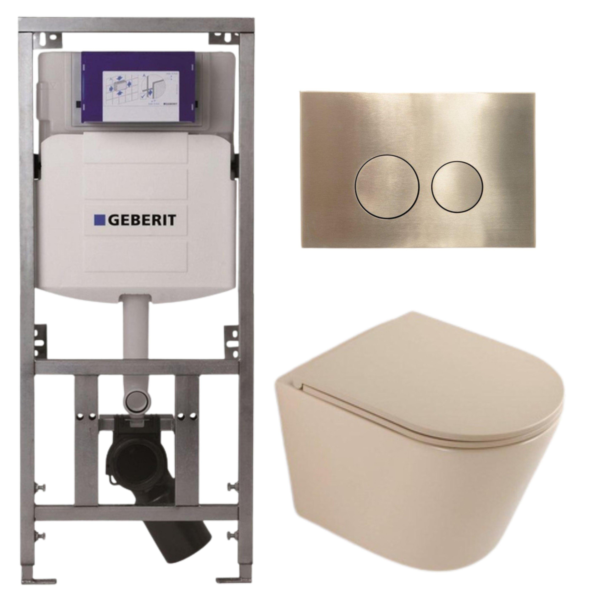 QeramiQ Dely Pack WC - 36,3x51,7cm - à fond creux - sans bride - réservoir encastré Geberit UP320 - abattant WC à fermeture douce - plaque de déclenchement en laiton brossé - boutons ronds - beige mat