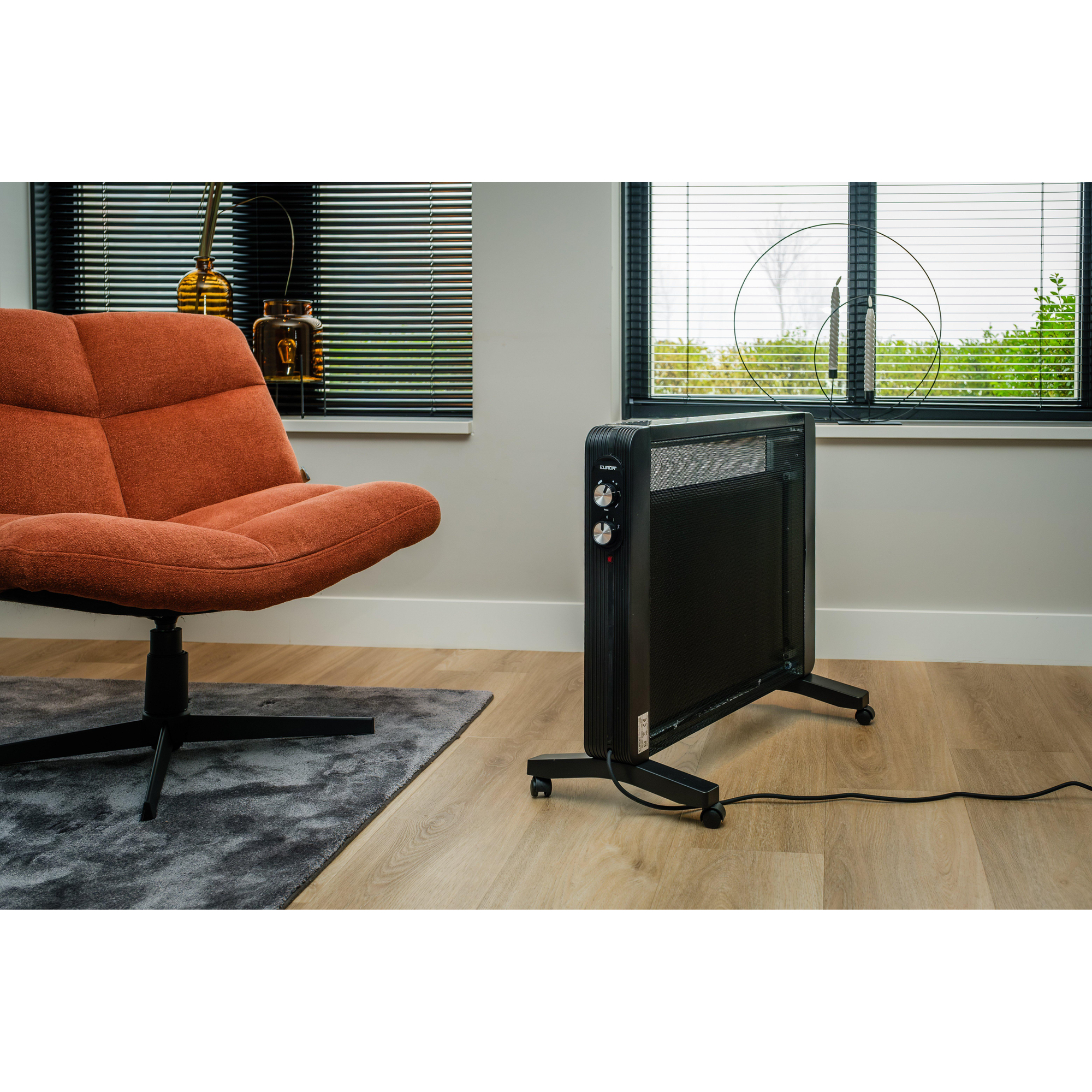 Vous recherchez un chauffage d’appoint puissant et silencieux qui permet d’atteindre rapidement une température agréable, sans devoir augmenter immédiatement tout le système de chauffage central ? Dans ce cas, un radiateur micathermique est un choix judicieux. Grâce à la combinaison de chaleur par rayonnement et de chaleur par convection, la pièce se réchauffe rapidement et de manière uniforme, idéal par exemple pour la salle de bains, le bureau, la chambre d’amis ou un séjour un peu frais. Grâce à son design sur pied et élancé, cet appareil occupe peu de surface au sol tout en offrant une capacité de chauffage élevée. Sa couleur noire neutre s’intègre sans effort dans les intérieurs modernes et intemporels, du style minimaliste à l’industriel. Ce chauffage électrique convient particulièrement comme source de chaleur flexible et mobile : vous le placez là où un confort supplémentaire est nécessaire, sans installation complexe ni travaux importants.