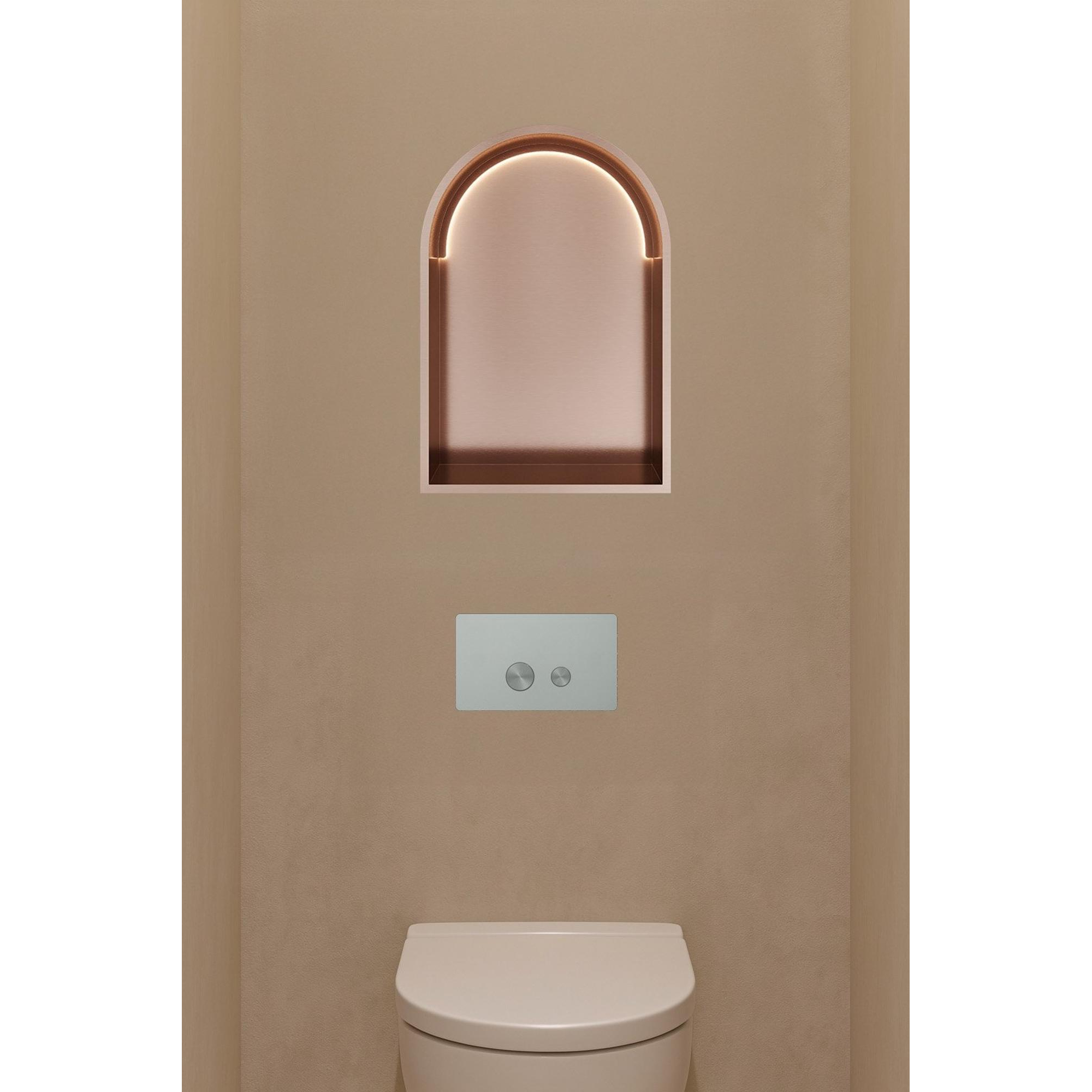 La couleur chaude du cuivre brossé donne à cette niche d'encastrement un aspect intemporel et luxueux. Le modèle en arcade crée une forme douce et accueillante qui s'intègre parfaitement dans les salles de bains modernes et classiques. Grâce à l'éclairage LED subtil, votre niche prend vie de manière magnifique, conférant à votre salle de bains une ambiance chaleureuse. Cela en fait non seulement un élément fonctionnel, mais aussi un véritable accroche-regard qui enrichit votre intérieur. Avec cette niche élégante, vous créez un endroit unique pour donner une touche personnelle à votre salle de bains.