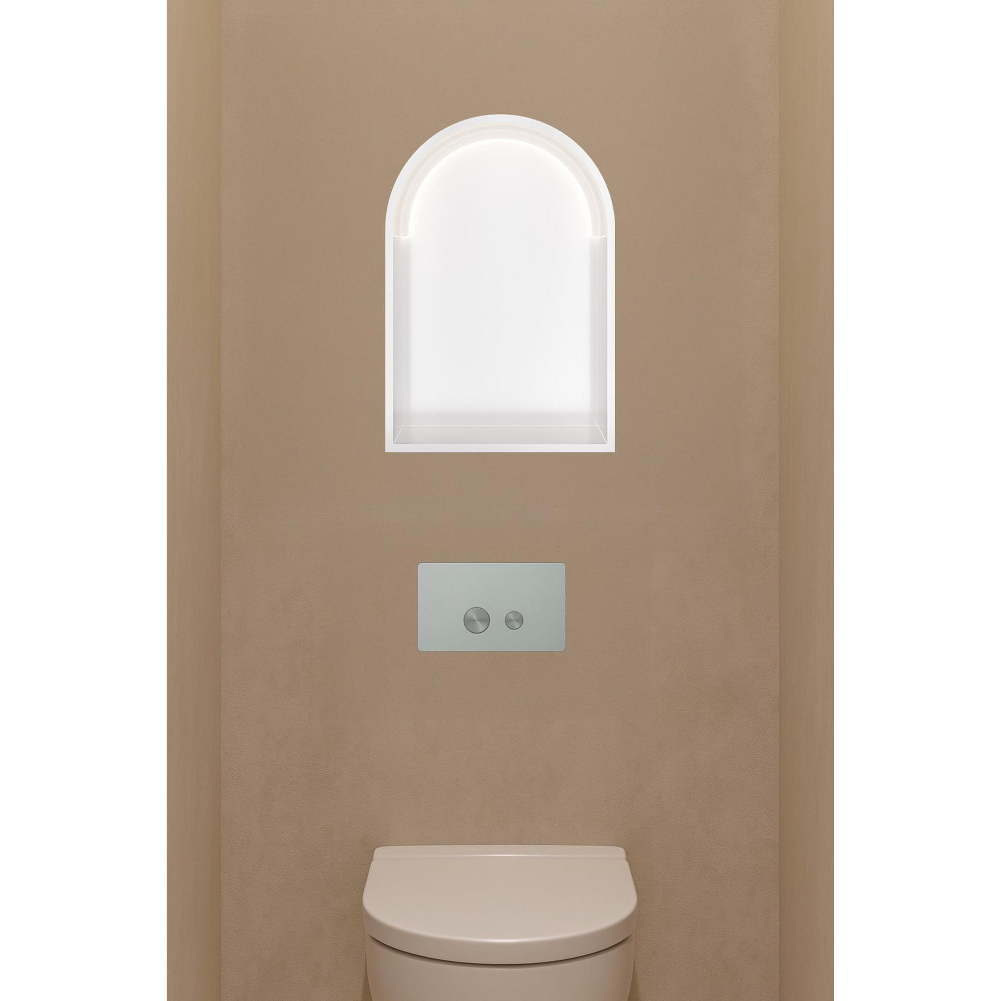 La finition blanche mate élégante et le modèle cintré confèrent à cette niche encastrée une apparence à la fois intemporelle et moderne. La courbe douce du modèle cintré ajoute un détail ludique, faisant de cette niche non pas un simple renfoncement, mais un véritable point de mire dans votre salle de bains. L’éclairage LED intégré met la forme en valeur et crée un point lumineux d’ambiance, ce qui donne immédiatement à la pièce une atmosphère plus luxueuse. Vous ne bénéficiez donc pas uniquement d’un espace de rangement supplémentaire, mais également d’un élément stylé qui apporte à votre salle de bains une touche personnelle et raffinée.