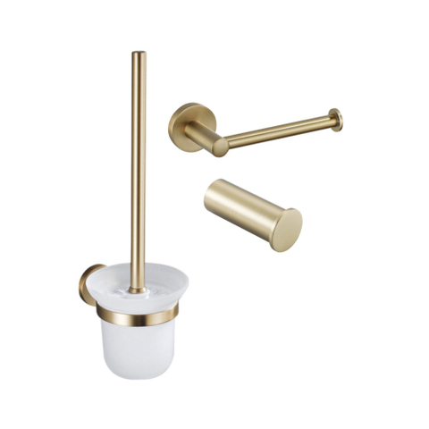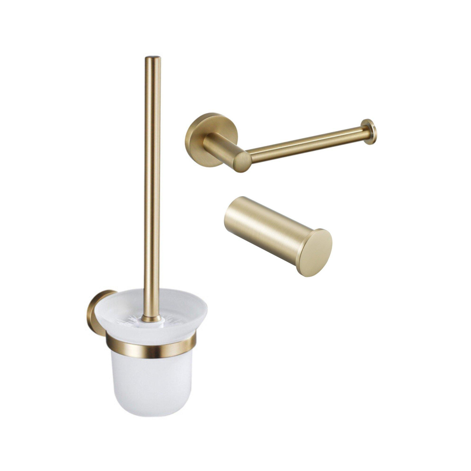 Fortifura Calvi Pack WC 3 pièces - porte-rouleau sans couvercle - brosse de toilette - crochet à serviette simple rond - Laiton brossé PVD (Or)