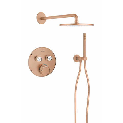 Grohe - Adema Rise Ensemble de douche pluie - rond - coude mural avec support de douchette - flexible de douche lisse - douchette à main barre - bras mural - pomme de douche principale 25cm - thermostat encastré Grohe SmartControl - brushed warm sunset