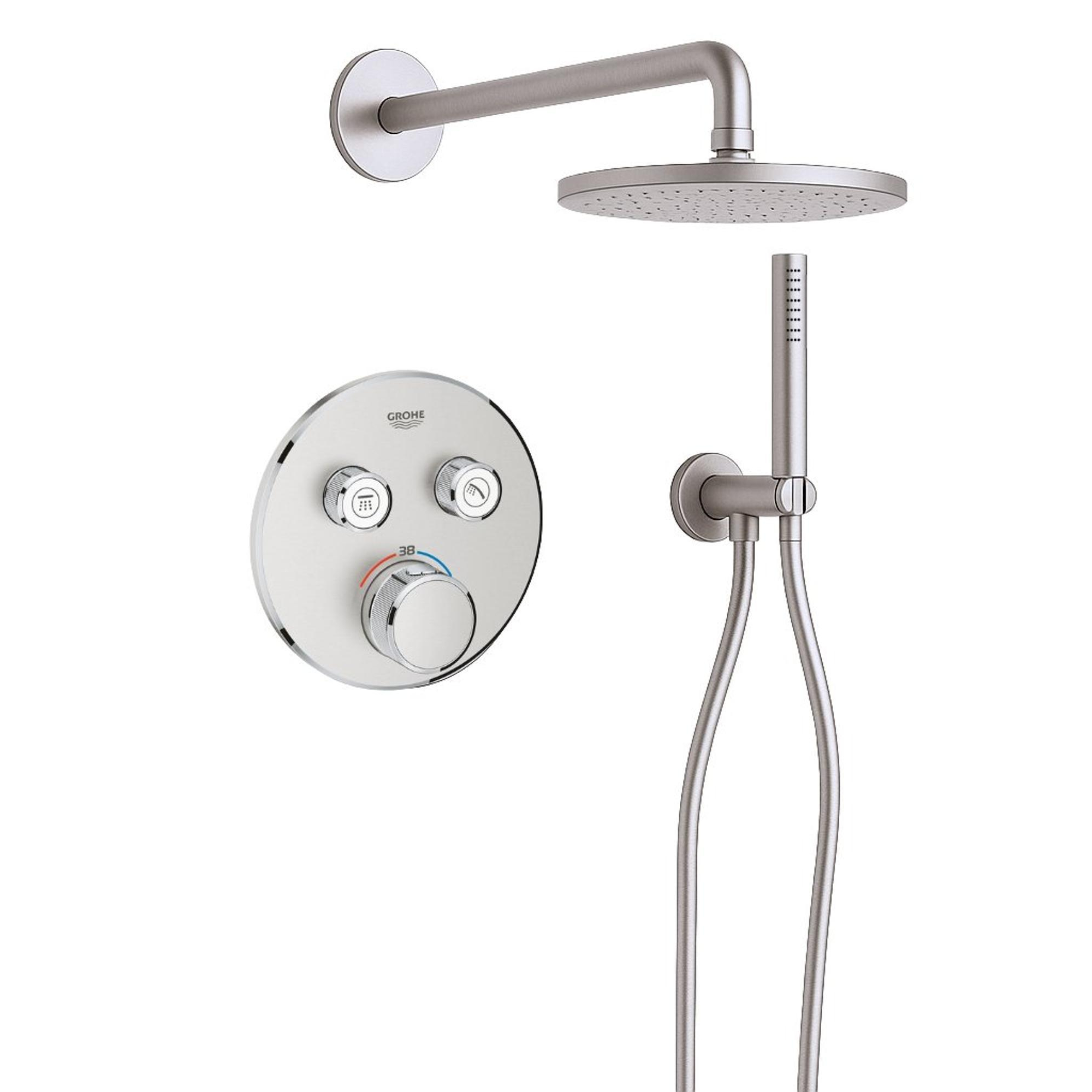 Grohe - Adema Rise Ensemble de douche pluie - rond - coude mural avec support de douchette - flexible de douche lisse - douchette à main barre - bras mural - pomme de douche 25 cm - thermostat encastré Grohe SmartControl - chrome