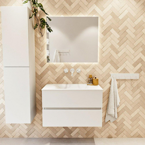 Avec ce meuble de salle de bains compact et épuré, vous créez en une seule fois du calme et une apparence ordonnée dans la salle de bains. La combinaison d’un sous-meuble de 80 cm de large avec deux tiroirs spacieux et d’un lavabo minimaliste sans trou de robinet est idéale si vous aimez un look moderne et calme tout en recherchant un espace de rangement pratique. Grâce à la couleur douce Talc, le meuble s’intègre sans effort aussi bien dans un style scandinave clair, une salle de bains sereine de type spa que dans un espace contemporain et minimaliste. Grâce au montage mural suspendu, le sol paraît spacieux et vous pouvez facilement nettoyer en dessous, ce qui fait surtout une grande différence dans les petites salles de bains. Si vous aimez choisir vous-même un robinet sur gorge ou un mitigeur mural et que vous souhaitez un plan de lavabo lisse et ininterrompu, cette version sans trou de robinet est un choix particulièrement raffiné et bien pensé.
