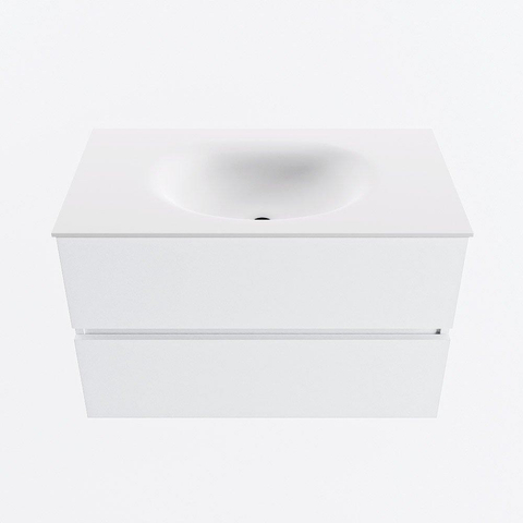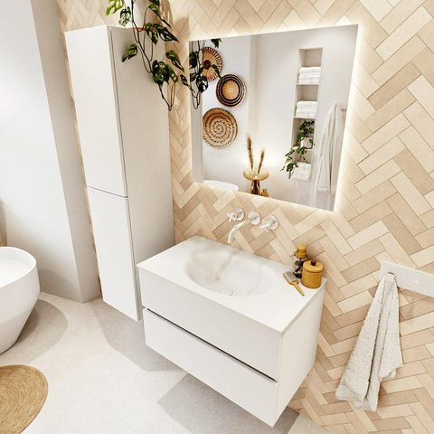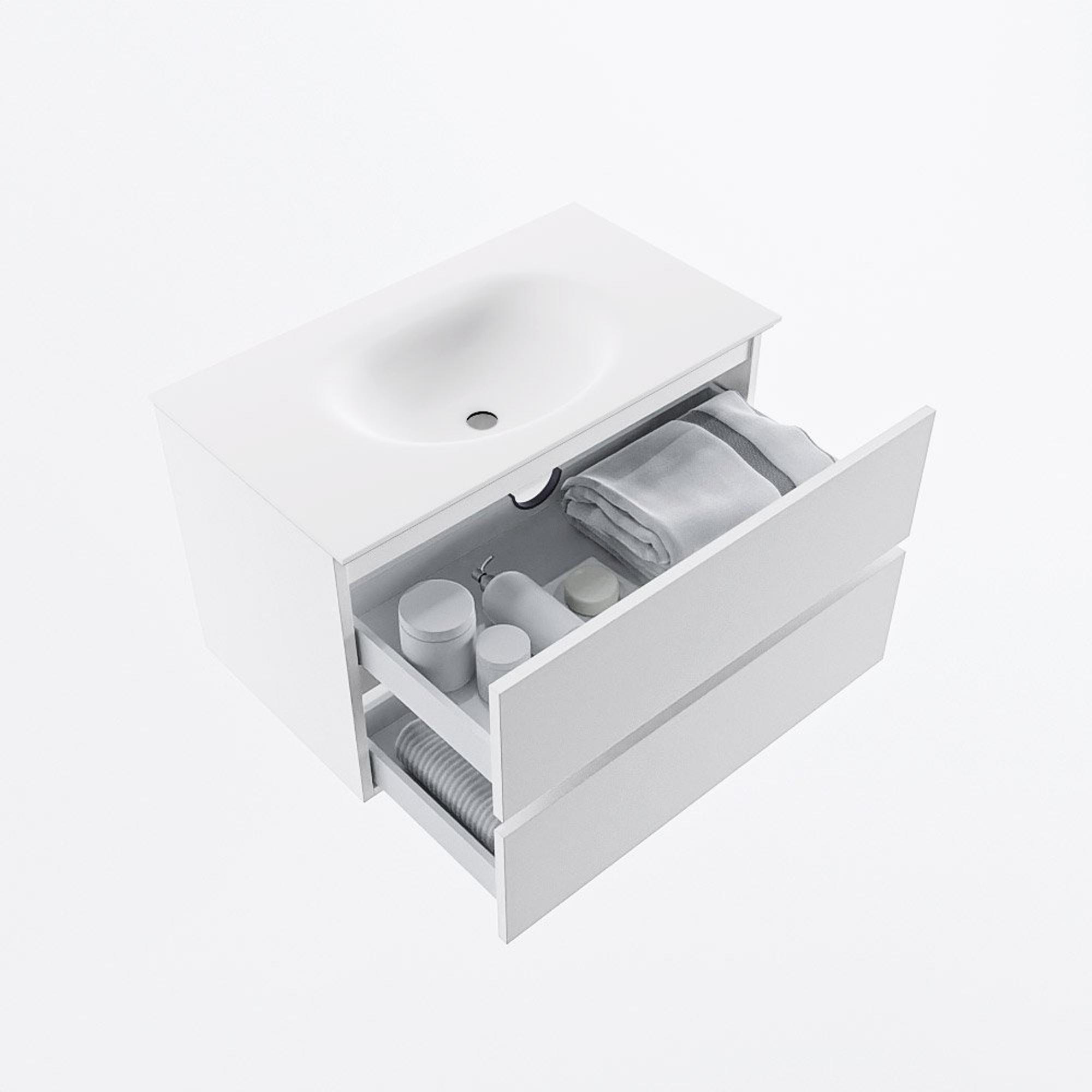 Le sous-meuble de 80 cm de large est équipé de deux tiroirs spacieux, afin que vous puissiez ranger discrètement toutes vos affaires de salle de bains du quotidien. Pensez aux serviettes, aux produits de soin et aux outils de coiffage : chaque chose a sa place, ce qui permet de garder le plan du lavabo clair et ordonné. Le lavabo est positionné au centre, ce qui vous laisse suffisamment d'espace de dépose à gauche comme à droite pour, par exemple, un distributeur de savon ou vos produits de soin préférés. Comme le lavabo n'a pas de trou de robinet, vous pouvez combiner cet ensemble avec un mitigeur sur gorge ou un mitigeur encastré dans le mur, ce qui apporte un supplément de design et offre plus de liberté dans le choix de votre robinet.