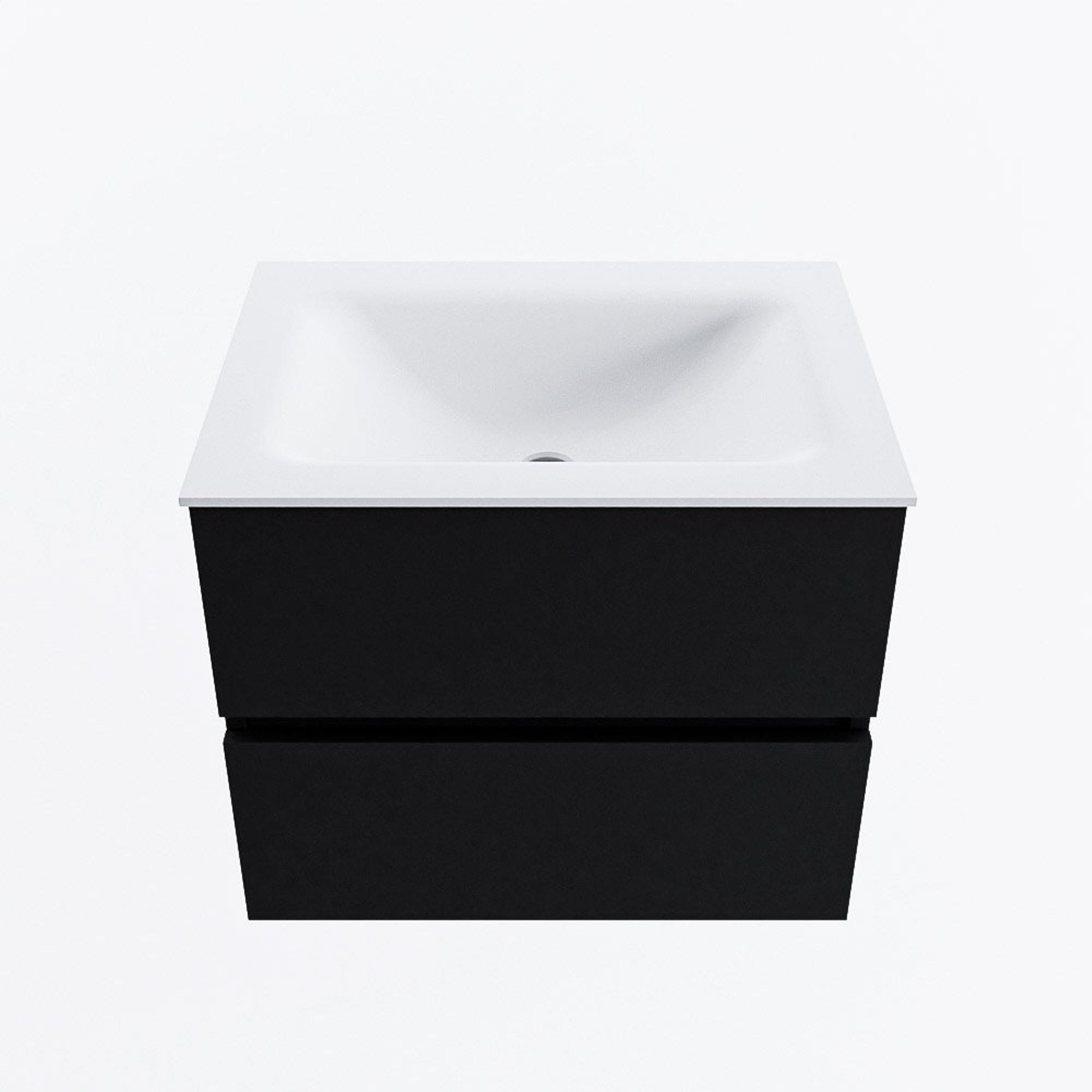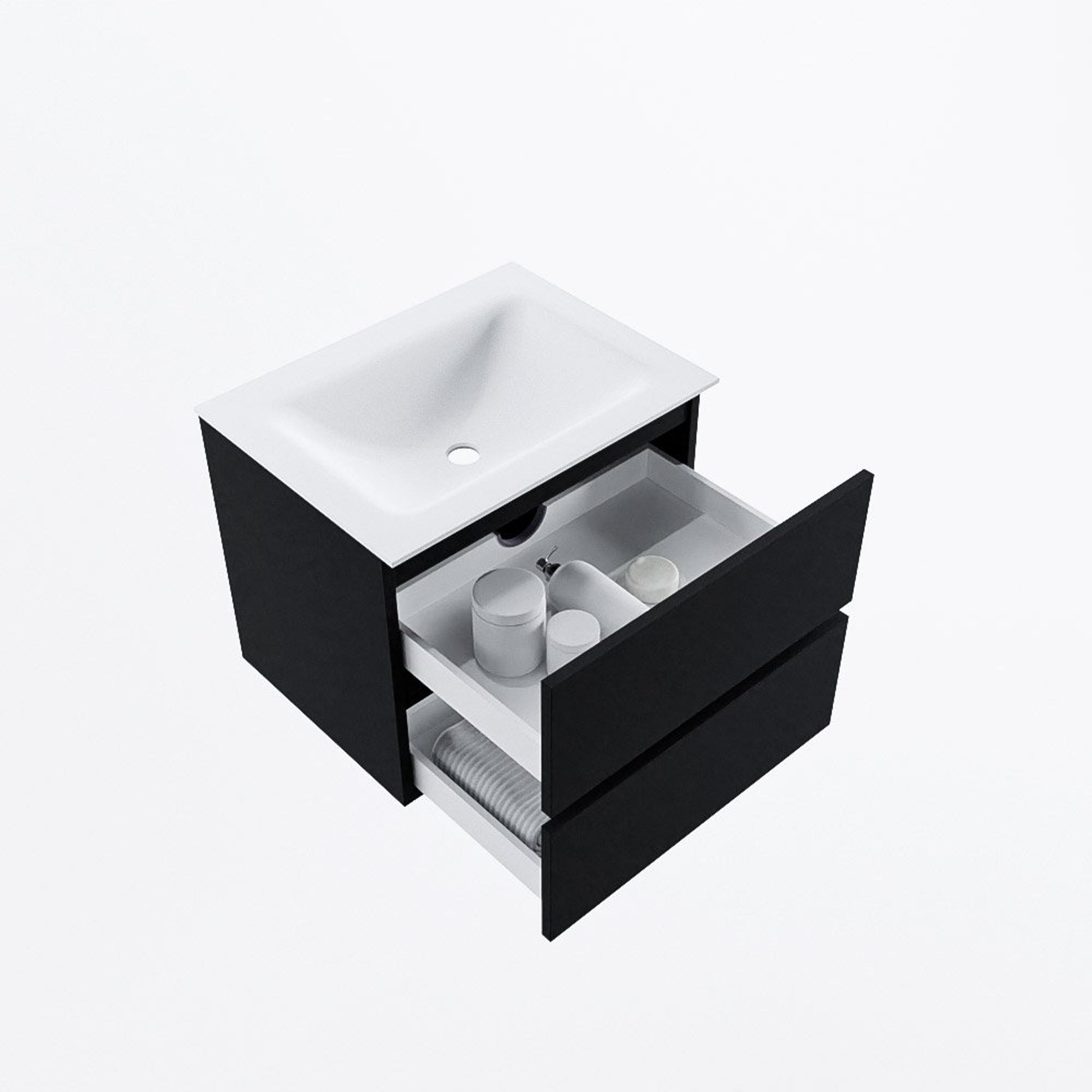 À l’usage quotidien, vous remarquez immédiatement la différence apportée par les détails de qualité choisis. Les tiroirs sont équipés de la fonction soft-close, ce qui les fait se fermer en douceur et sans bruit. Cela procure non seulement une sensation de luxe, mais prolonge également la durée de vie du meuble et évite que le contenu ne glisse ou ne s’abîme. Le caisson bas est réalisé en MDF, un choix courant et fiable pour les meubles de salle de bains, et le plateau est fabriqué en solid surface : net, sans joints et agréable à entretenir. Le lavabo intégré avec un trou de robinet central offre suffisamment de place autour de la cuve pour manipuler confortablement votre robinet et vous laver les mains en tout confort. Vous profitez ainsi d’un meuble qui n’est pas seulement agréable à regarder, mais surtout agréable à utiliser, jour après jour.