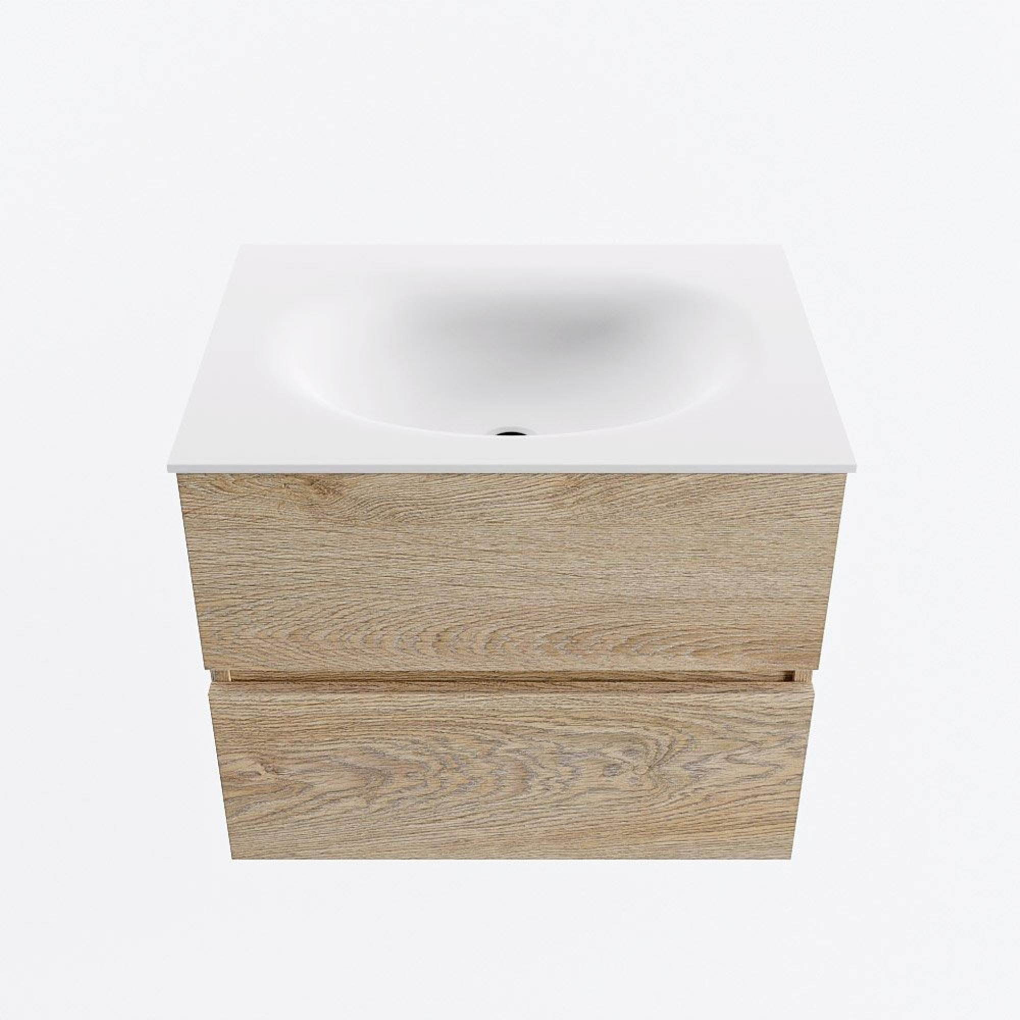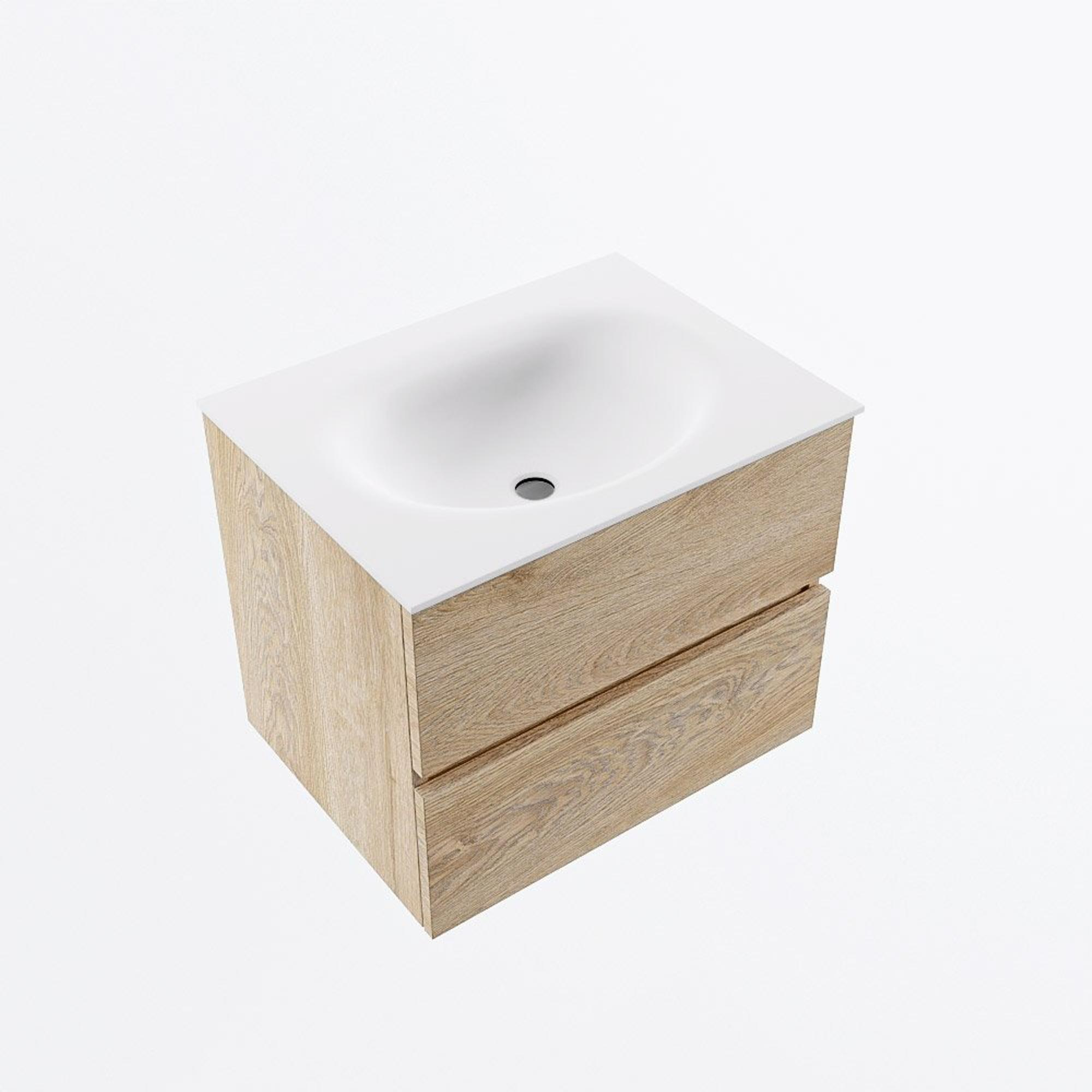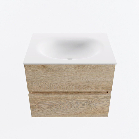 MONDIAZ VICA meuble sous lavabo 60cm Chêne blanchi 2 tiroirs. Lavabo MOON central sans trou de robinet, couleur Talc.