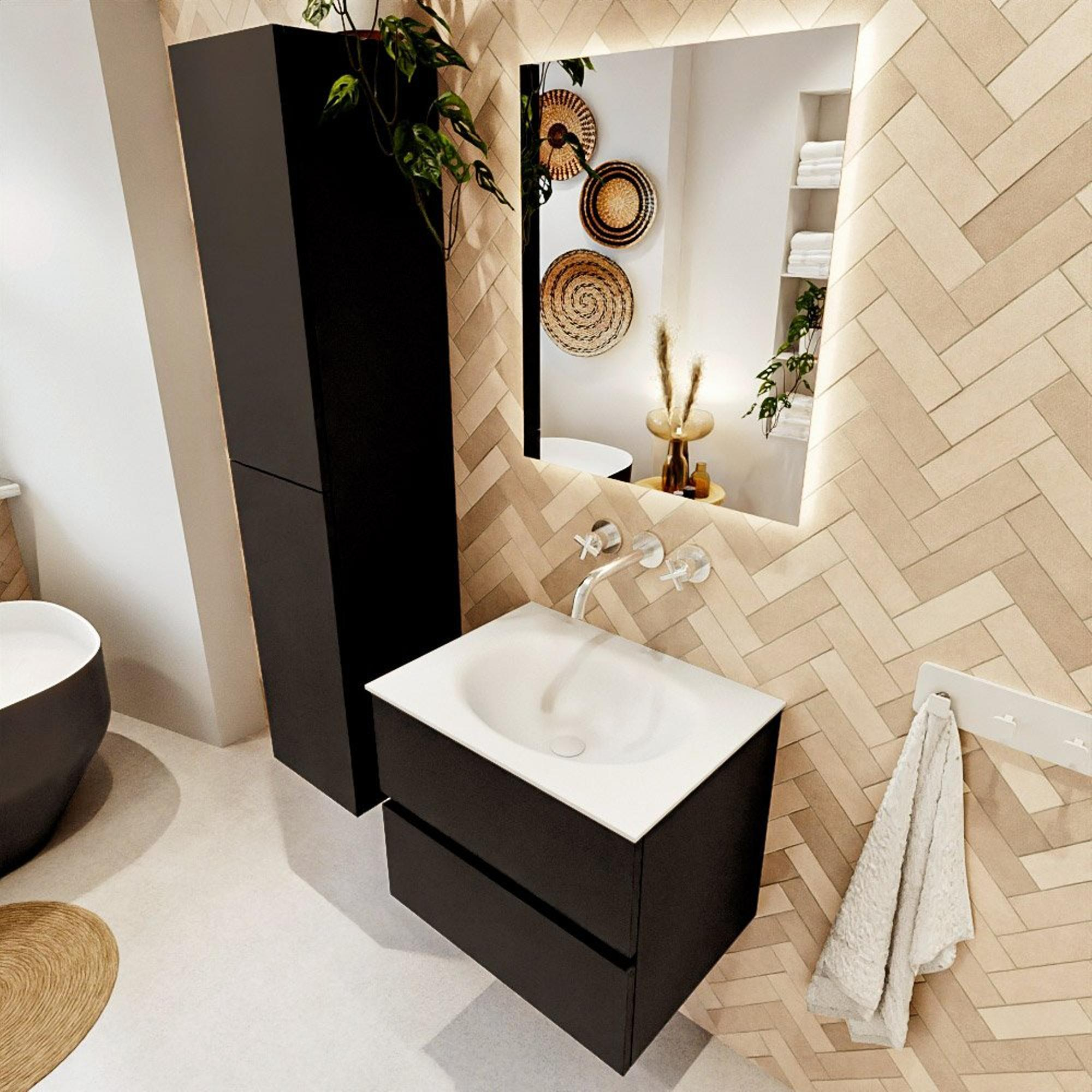 Ce meuble de salle de bains compact de 60 cm de large est un choix idéal si vous souhaitez créer un look élégant et apaisant sans faire de compromis sur l’espace de rangement. Grâce aux deux tiroirs, vous gardez vos essentiels du quotidien soigneusement hors de vue, tandis que le lavabo central offre une disposition logique et confortable. La combinaison d’un design épuré sans poignées, du style Urban et de la douce couleur Talc rend ce meuble particulièrement adapté aux salles de bains modernes et scandinaves, mais aussi à un style hôtel épuré dans un espace plus réduit. Le plan-vasque en Solid Surface sans trou de robinet vous offre en plus toute la liberté de choisir vous-même un mitigeur à poser et une finition assortie, afin que l’ensemble corresponde parfaitement à vos goûts et à votre utilisation.