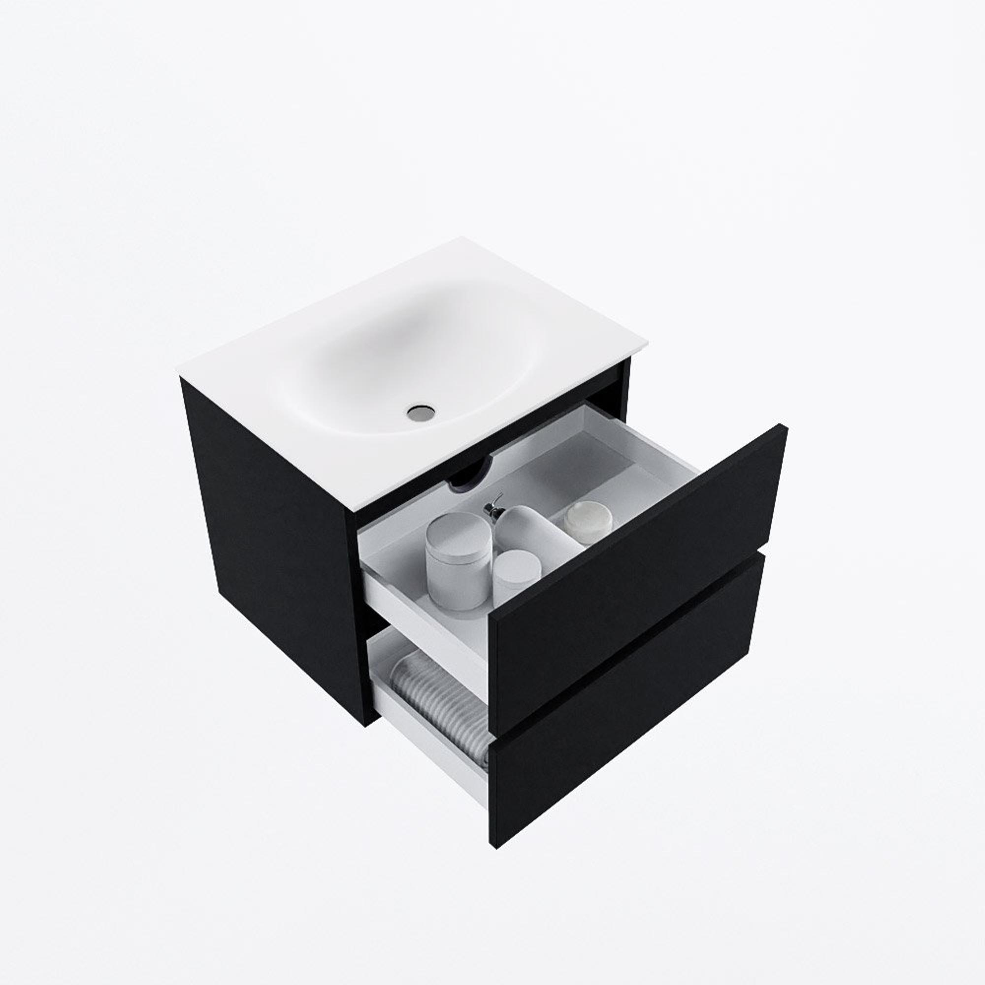 Avec deux tiroirs spacieux, vous disposez d’un volume de rangement surprenant sur une largeur relativement compacte de 60 cm. Pensez aux serviettes, produits de soin, sèche-cheveux, accessoires de rasage et maquillage : chaque chose trouve une place fixe et bien organisée, de sorte que votre plan de toilette peut rester dégagé. Cela ne procure pas seulement de la sérénité, mais rend également vos routines du matin et du soir plus efficaces. La fixation murale standard libère le sol, ce qui donne à la salle de bains une apparence plus spacieuse et vous permet en outre de nettoyer plus facilement sous le meuble. Combiné à la profondeur standard, ce modèle offre un bel équilibre entre confort au lavabo et espace de circulation suffisant.