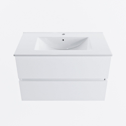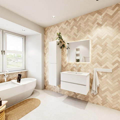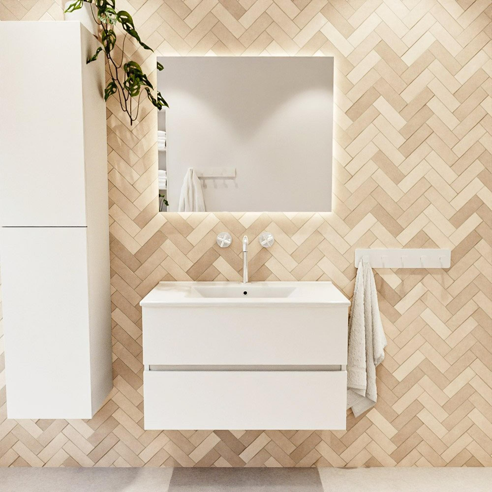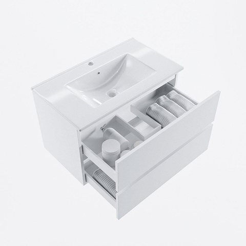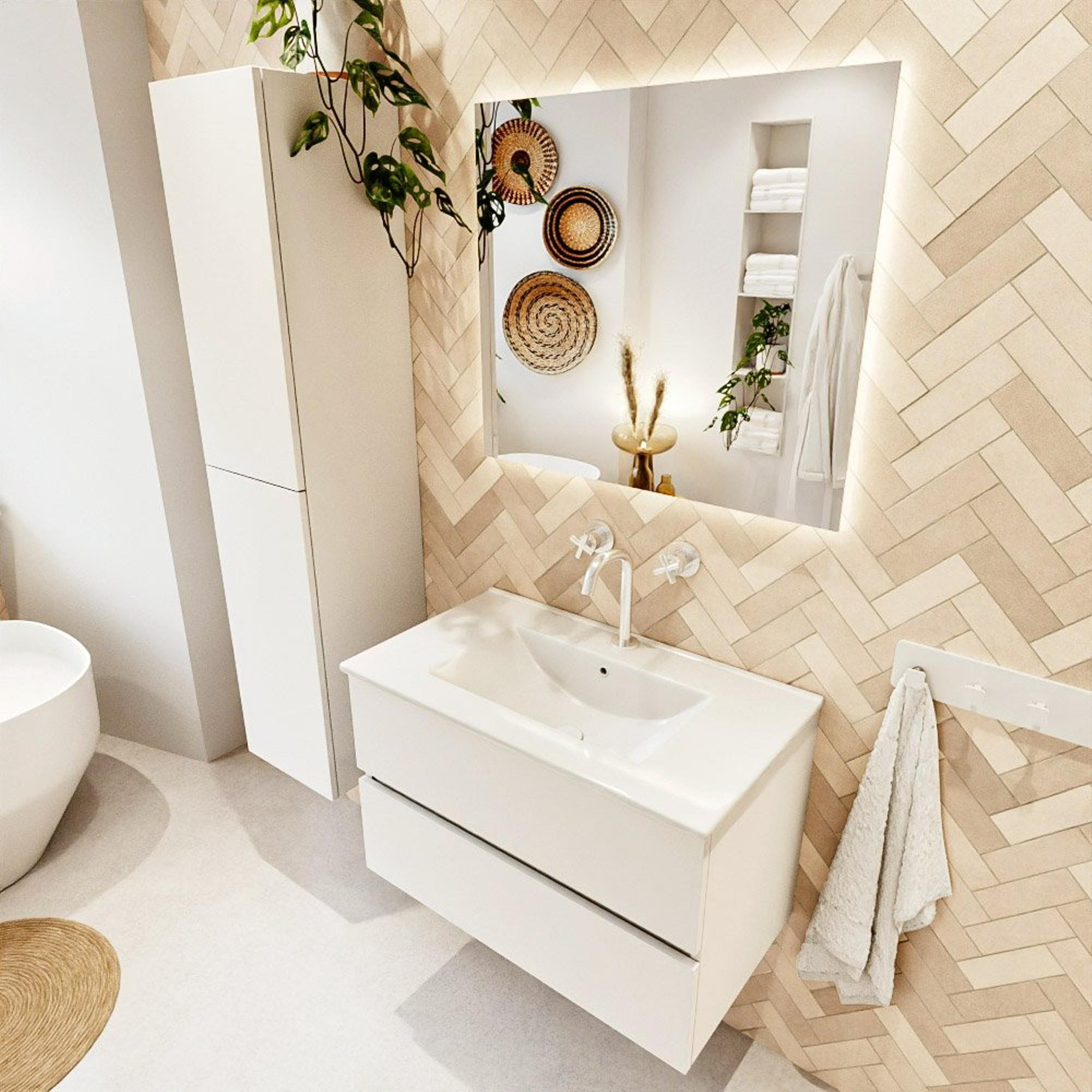MONDIAZ VICA meuble sous lavabo 80cm Talc 2 tiroirs. Lavabo DENIA centre 1 trou de robinet, couleur Blanc Brillant.