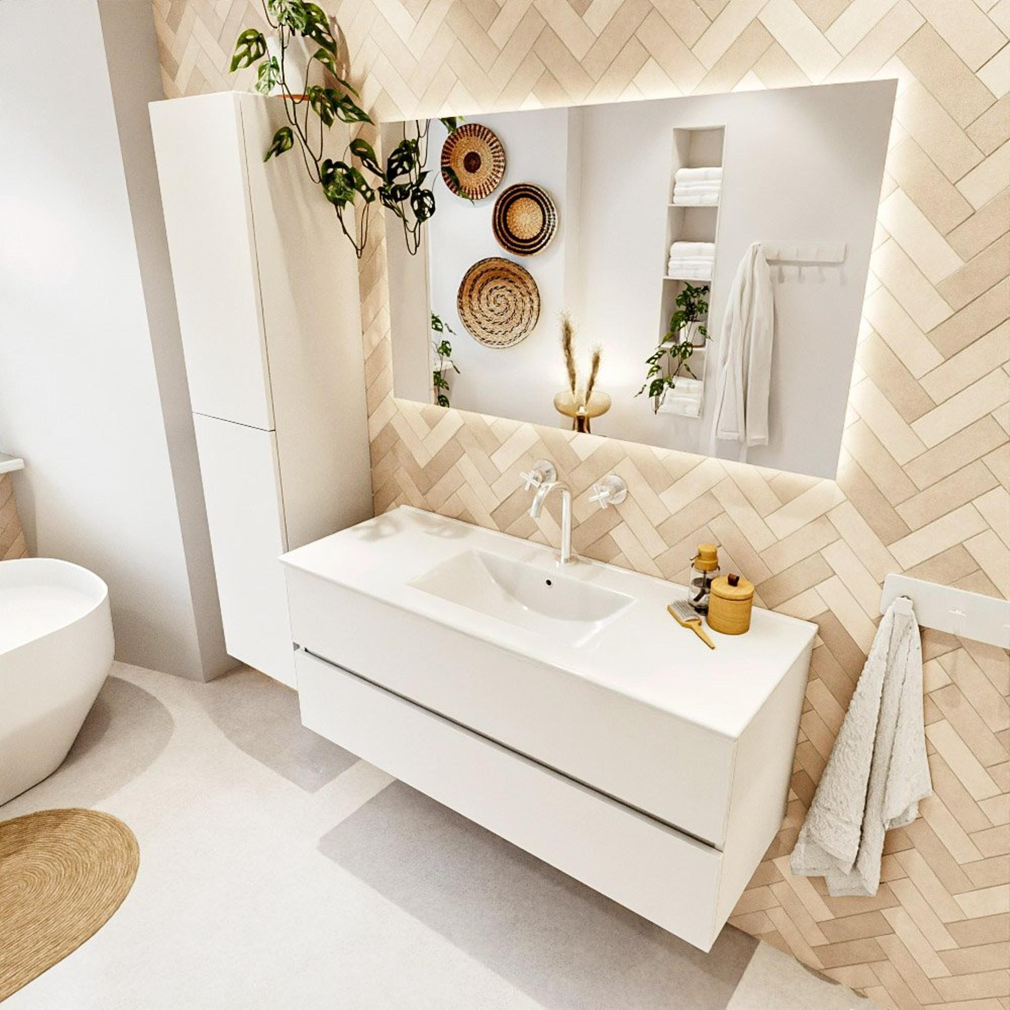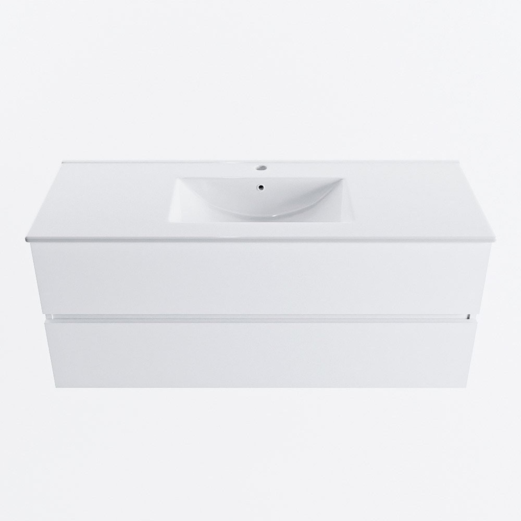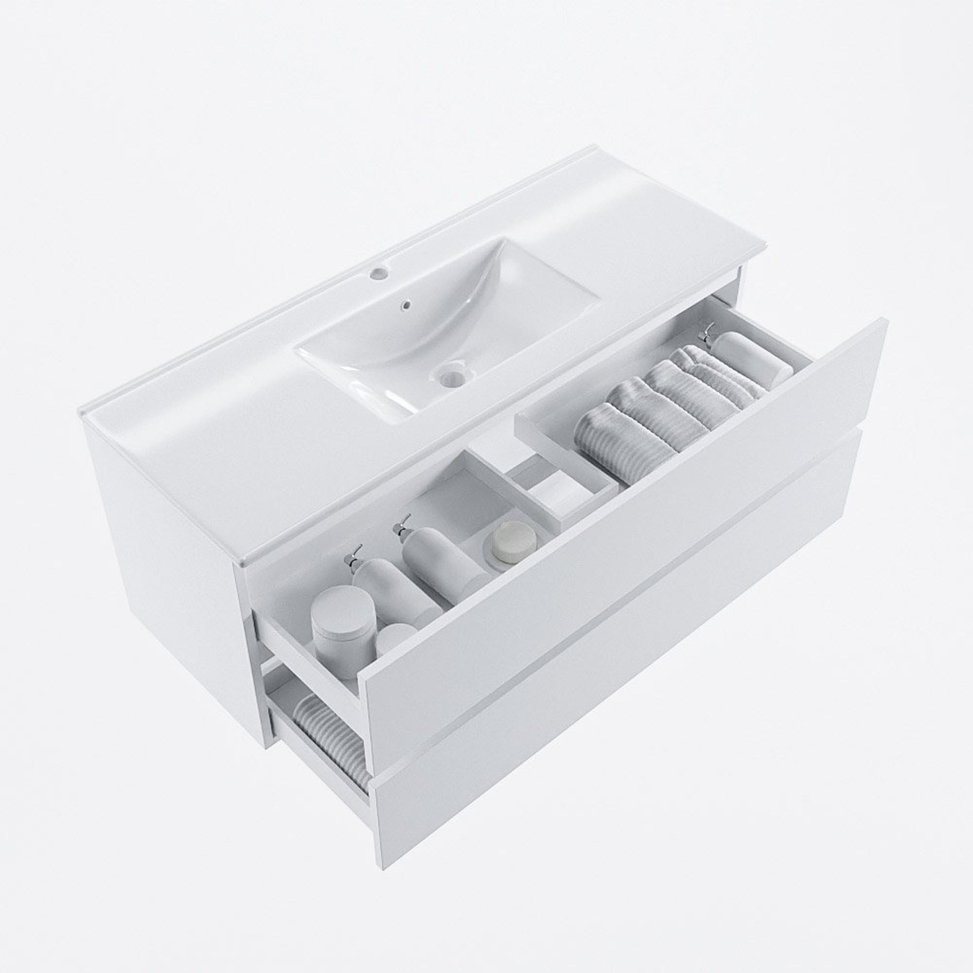 MONDIAZ VICA meuble sous lavabo 120cm Talc 2 tiroirs. Lavabo DENIA centre 1 trou de robinet, couleur Blanc Brillant.
