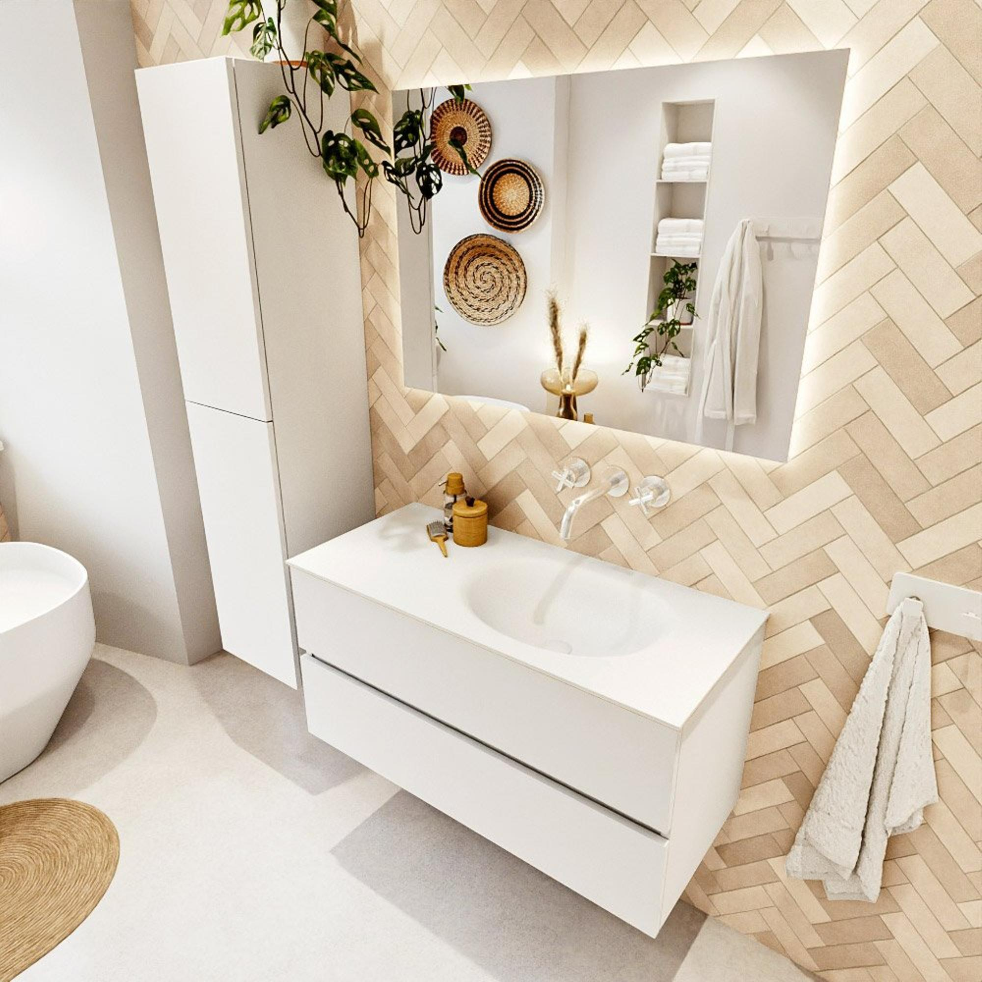 MONDIAZ VICA 100cm meuble sous lavabo Talc 2 tiroirs. Lavabo MOON droit sans trou de robinet, couleur Talc.